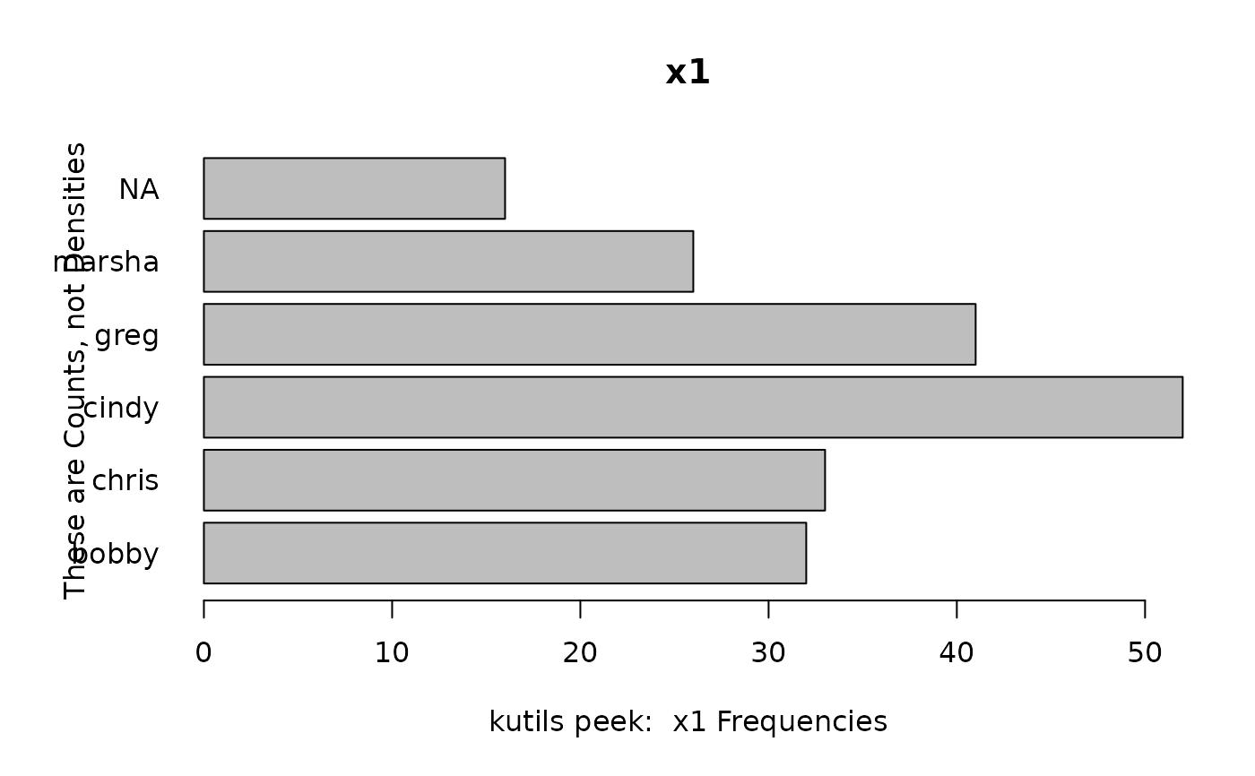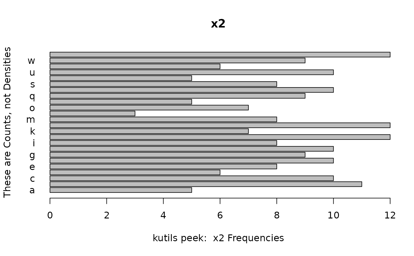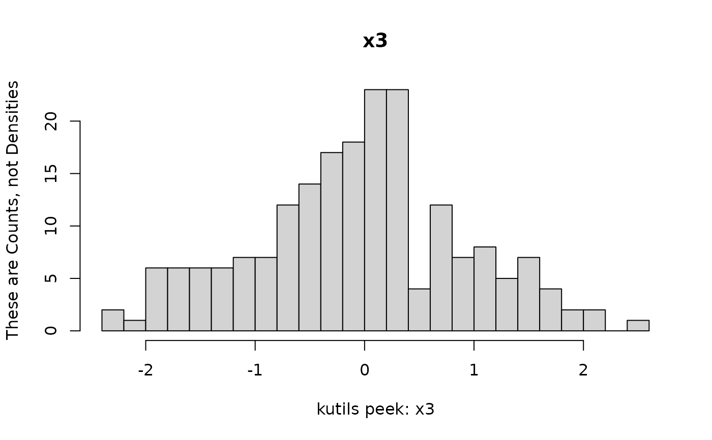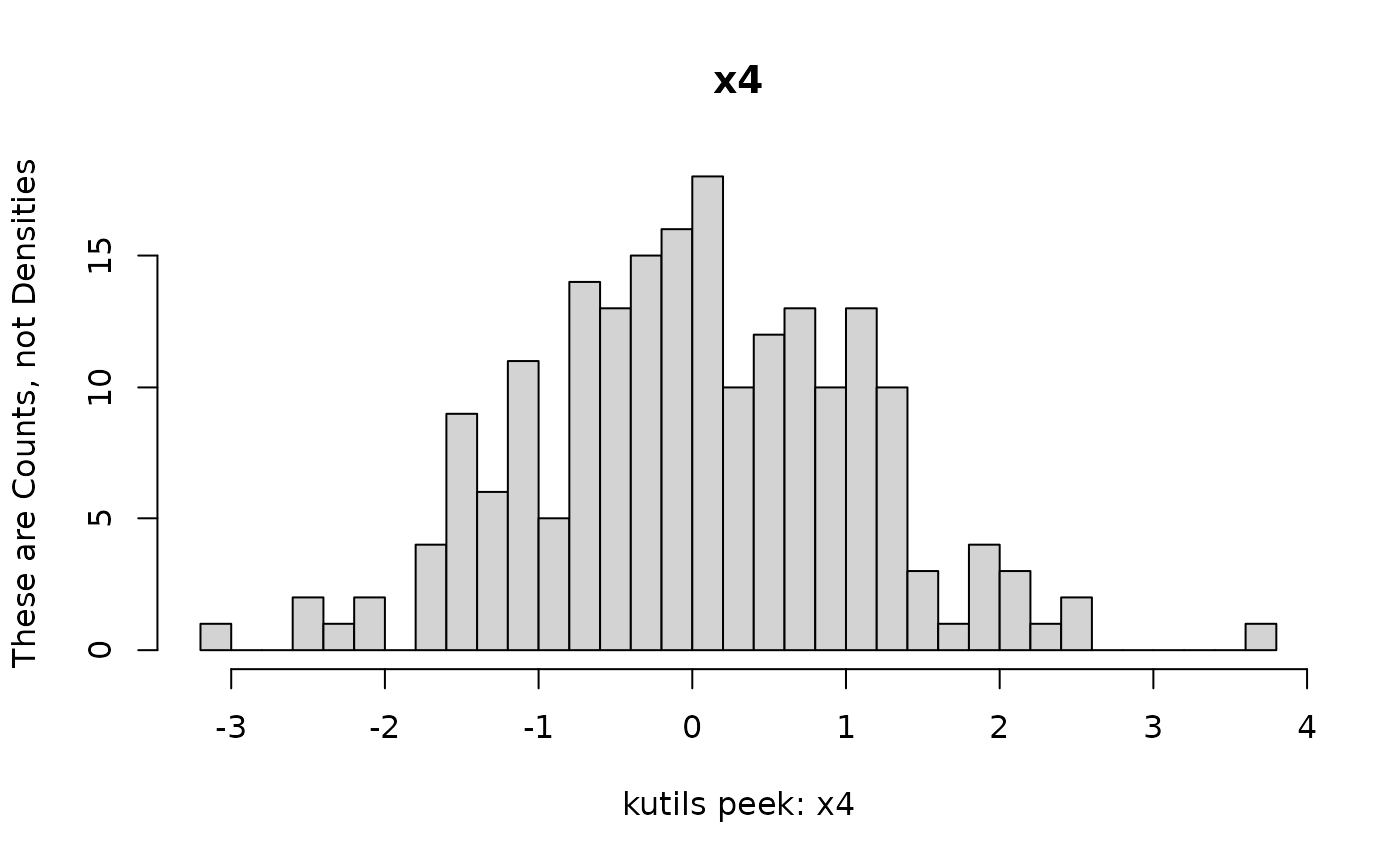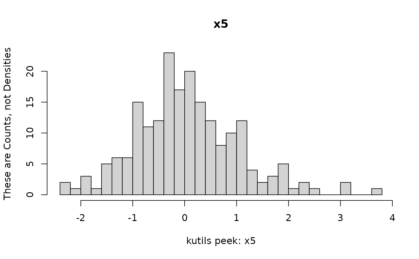 peek(mydf, breaks = 30, ylab = "These are Counts, not Densities", freq = TRUE,