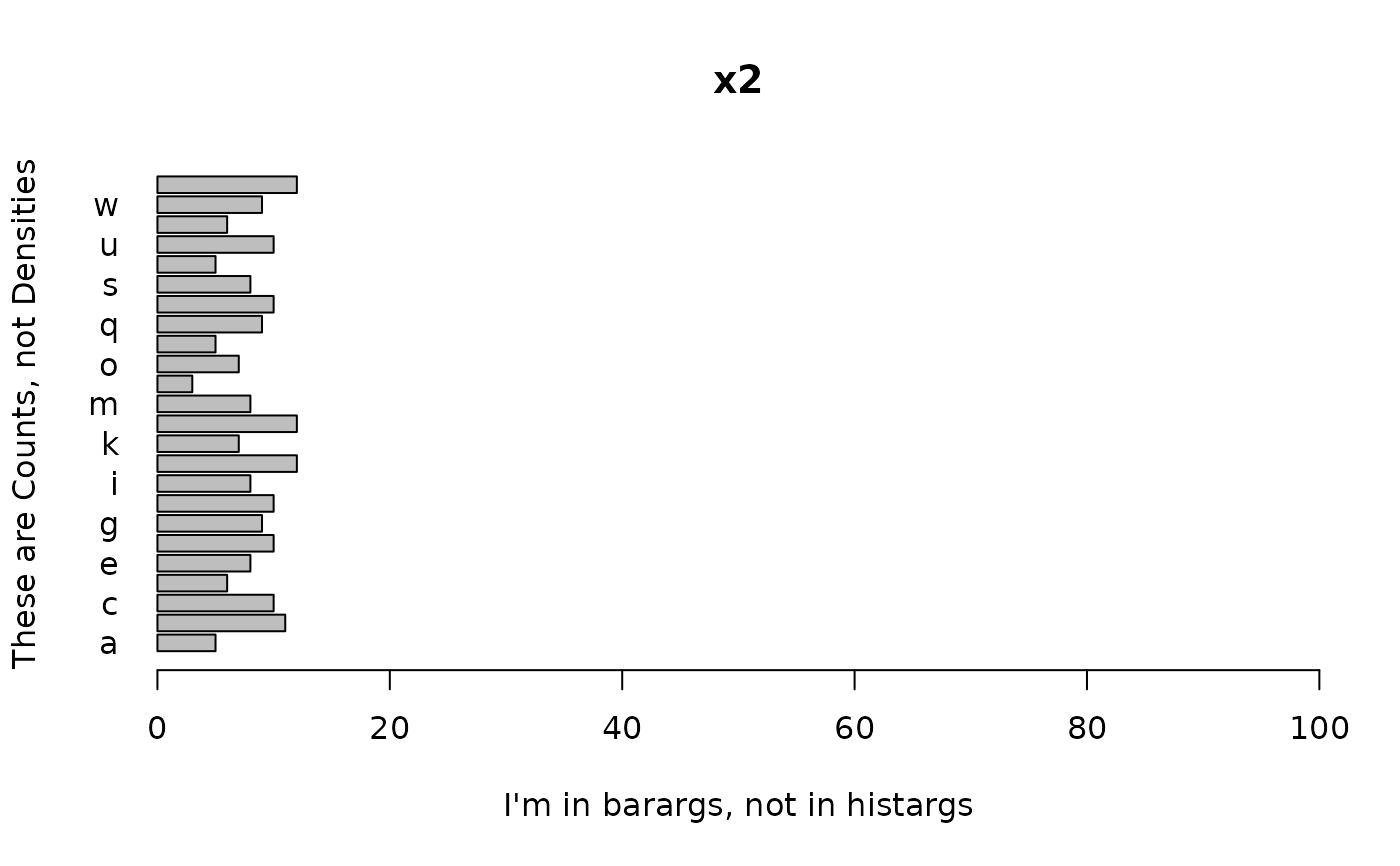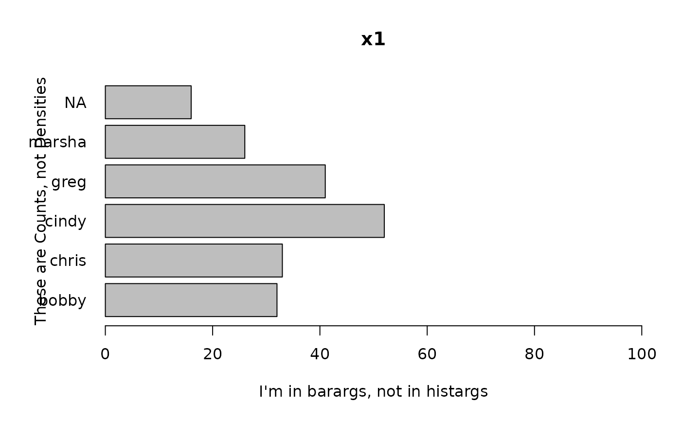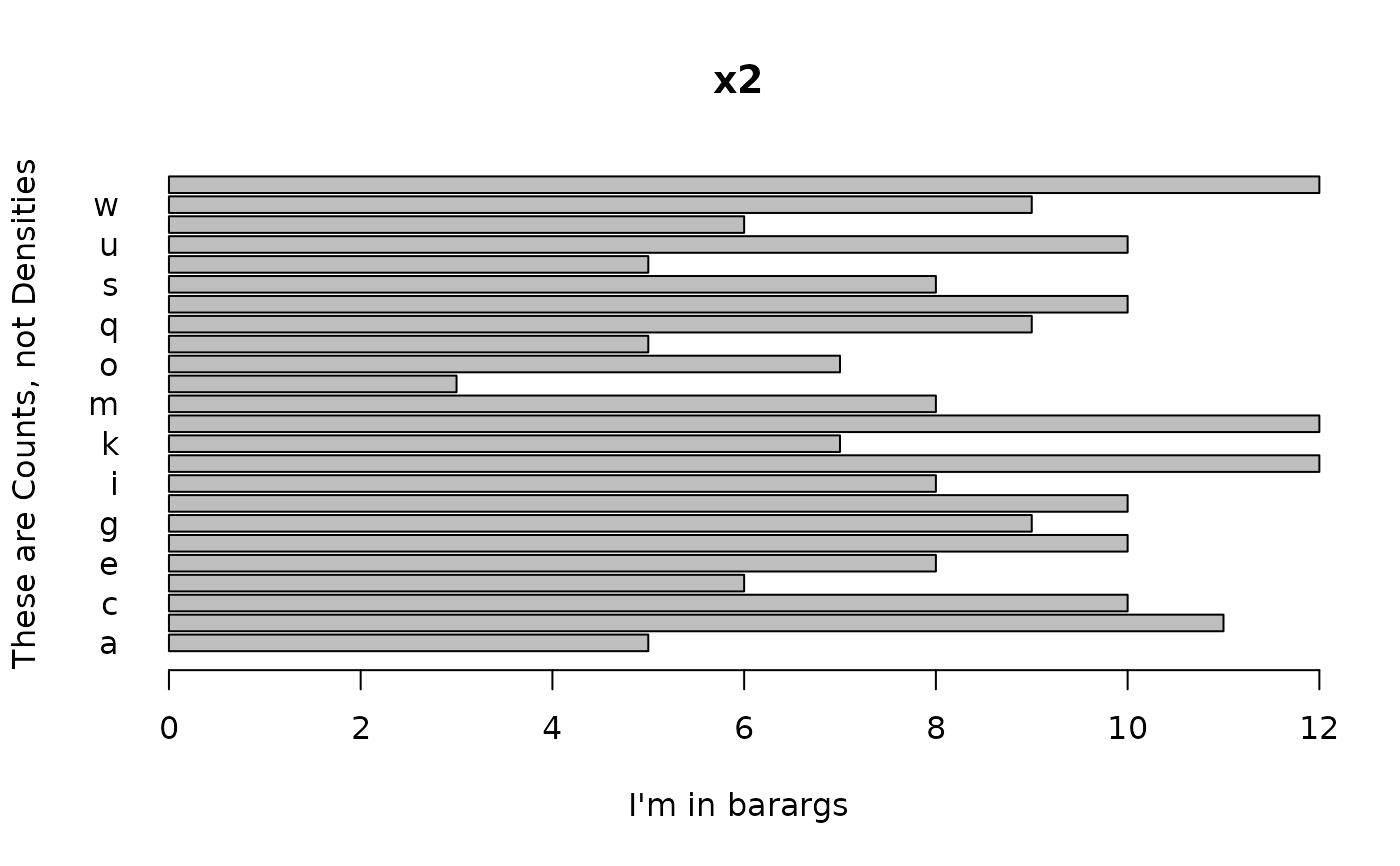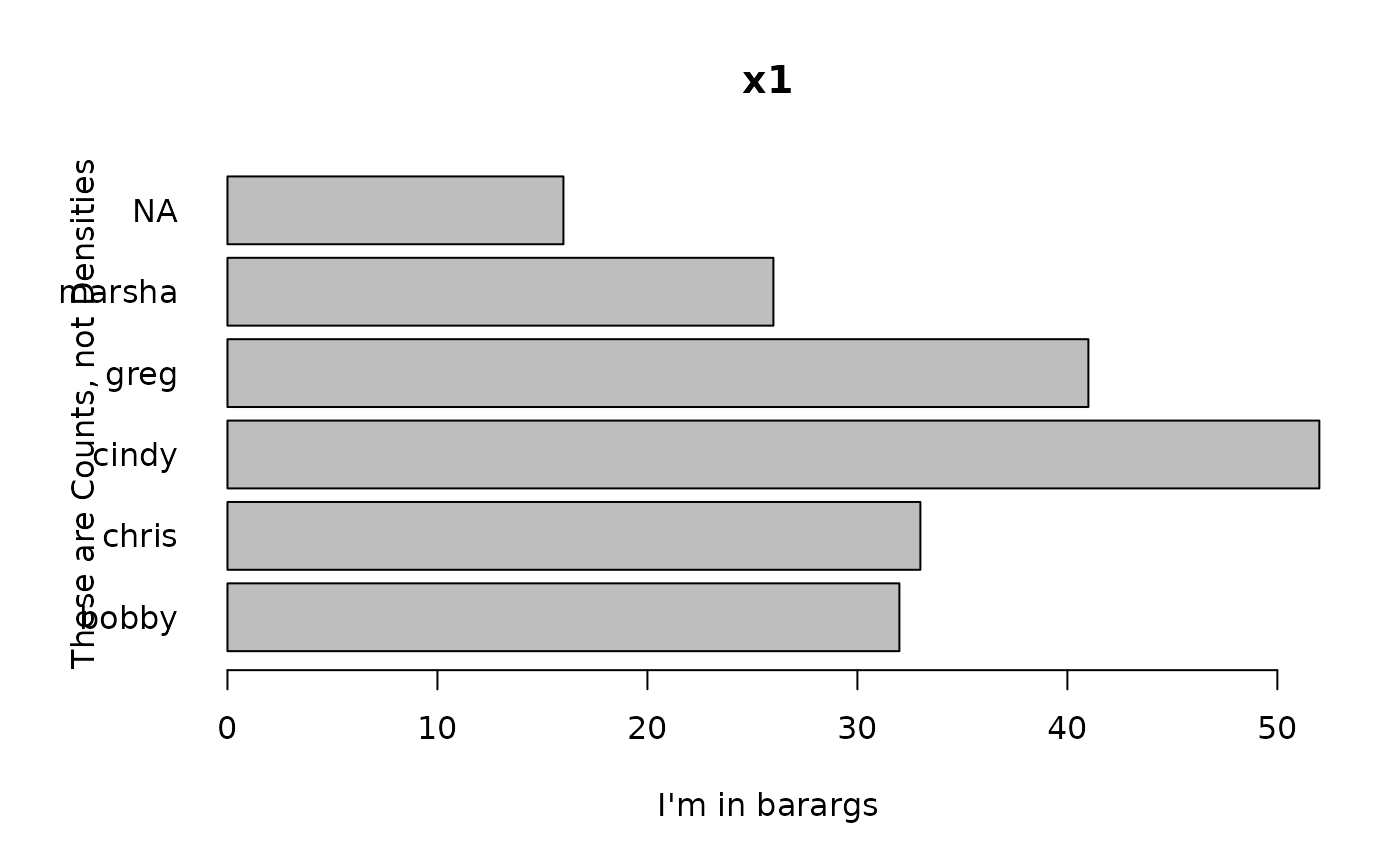 freq = TRUE, barargs = list(horiz = TRUE, las = 1, xlab = "I'm in barargs"))