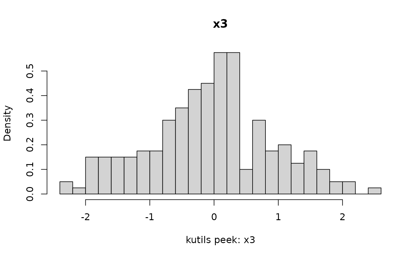 peek(mydf, breaks = 30, ylab = "These are Counts, not Densities", freq = TRUE)
