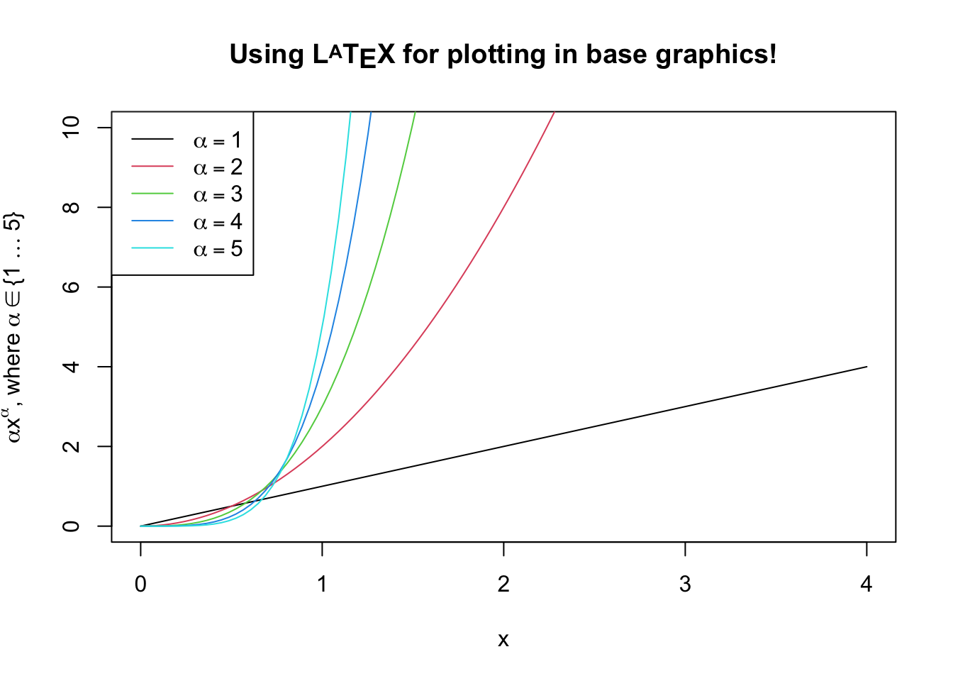 xlab='x', ylab=TeX(r'($\alpha x^\alpha$, where $\alpha \in \{1 \ldots 5\}$)'),