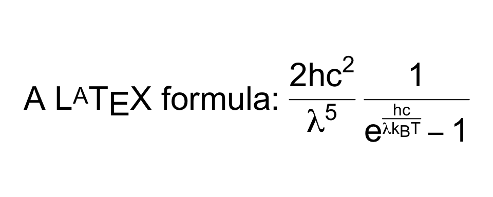 plot(TeX(r'(A $\LaTeX$ formula: $\frac{2hc^2}{\lambda^5}\frac{1}{e^{\frac{hc}{\lambda k_B T}} - 1}$)'), cex=2, main="")