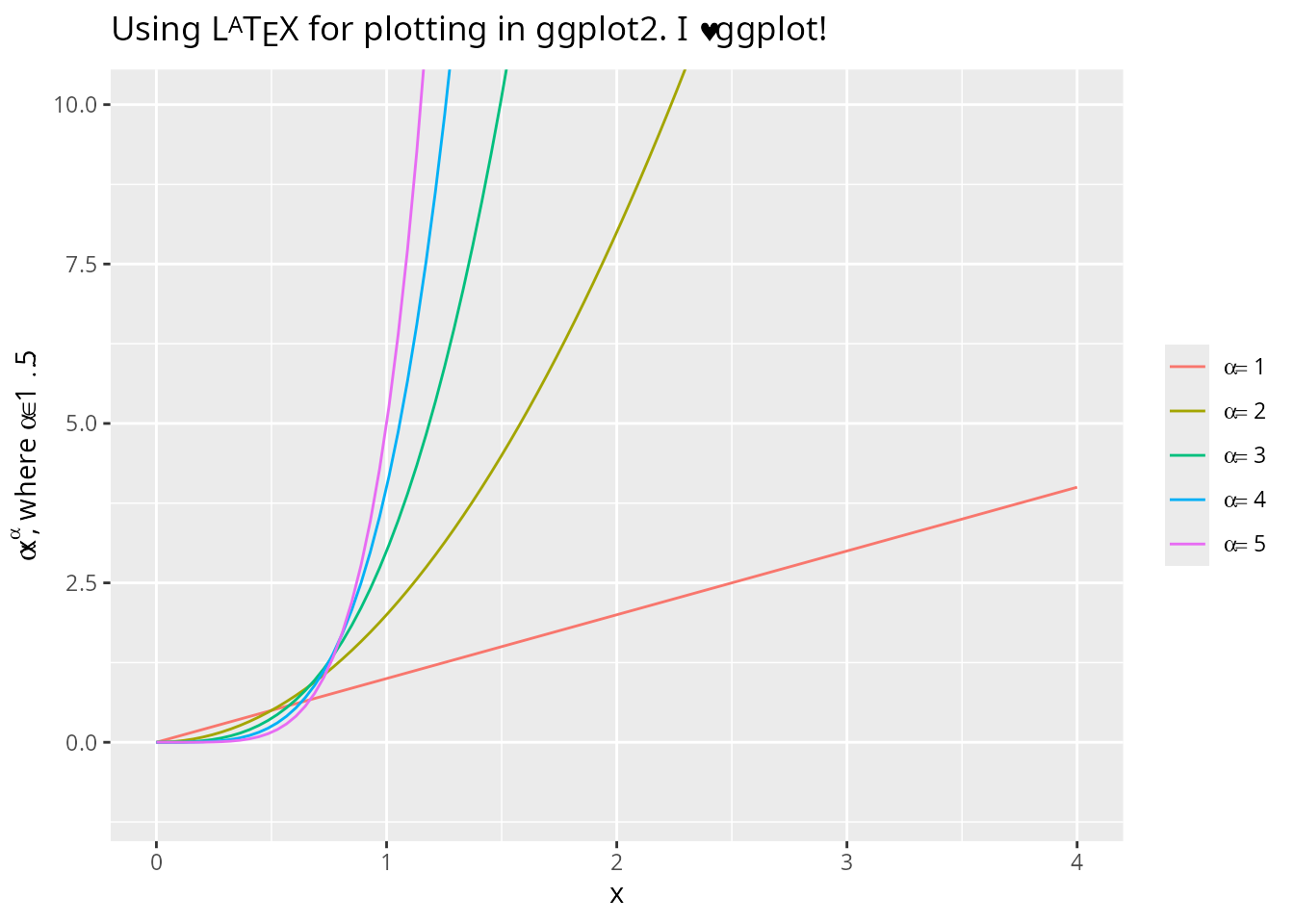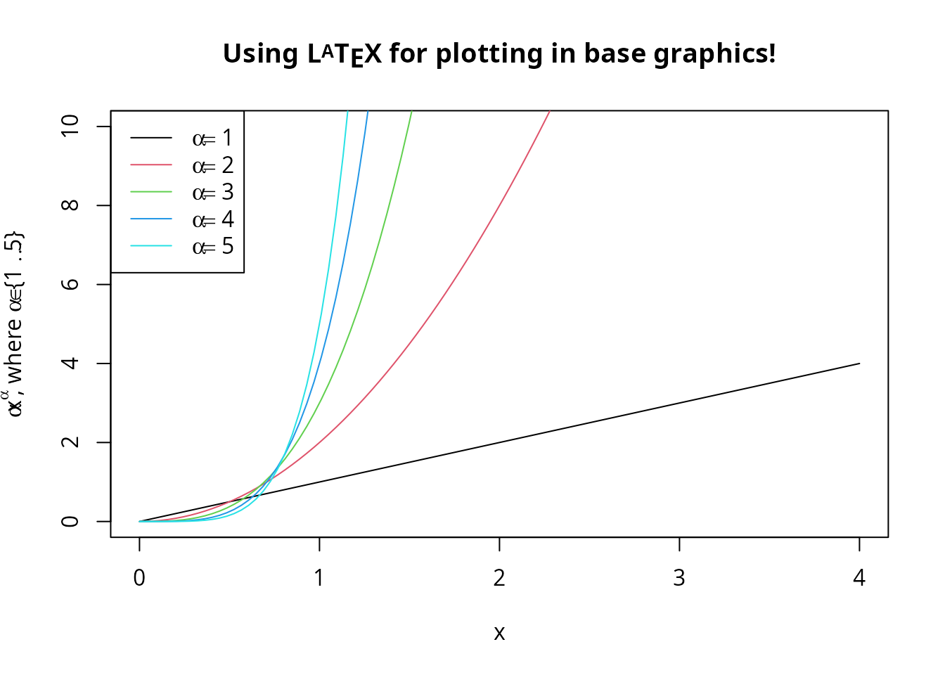 xlab = 'x', ylab = TeX(r'($\alpha x^\alpha$, where $\alpha \in \{1 \ldots 5\}$)'),