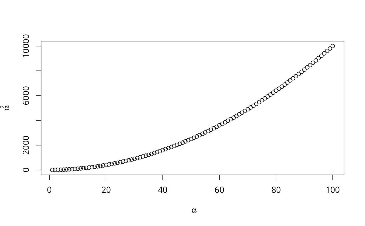 plot(a, a^2, xlab = TeX("$\\alpha$"), ylab = TeX("$\\alpha^2$"))