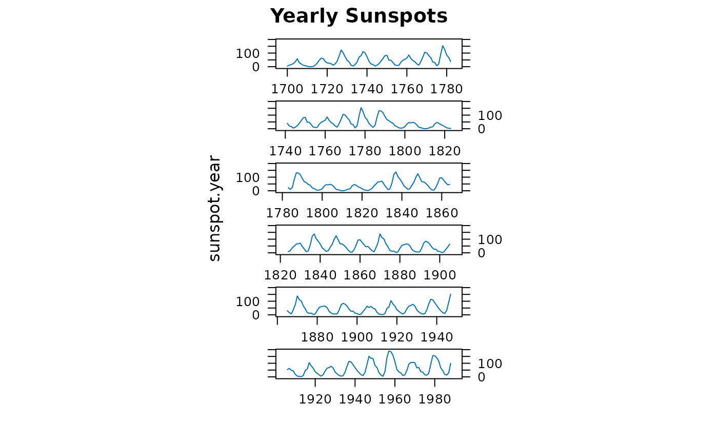 xyplot(sunspot.year ~ time(sunspot.year) | equal.count(time(sunspot.year)),