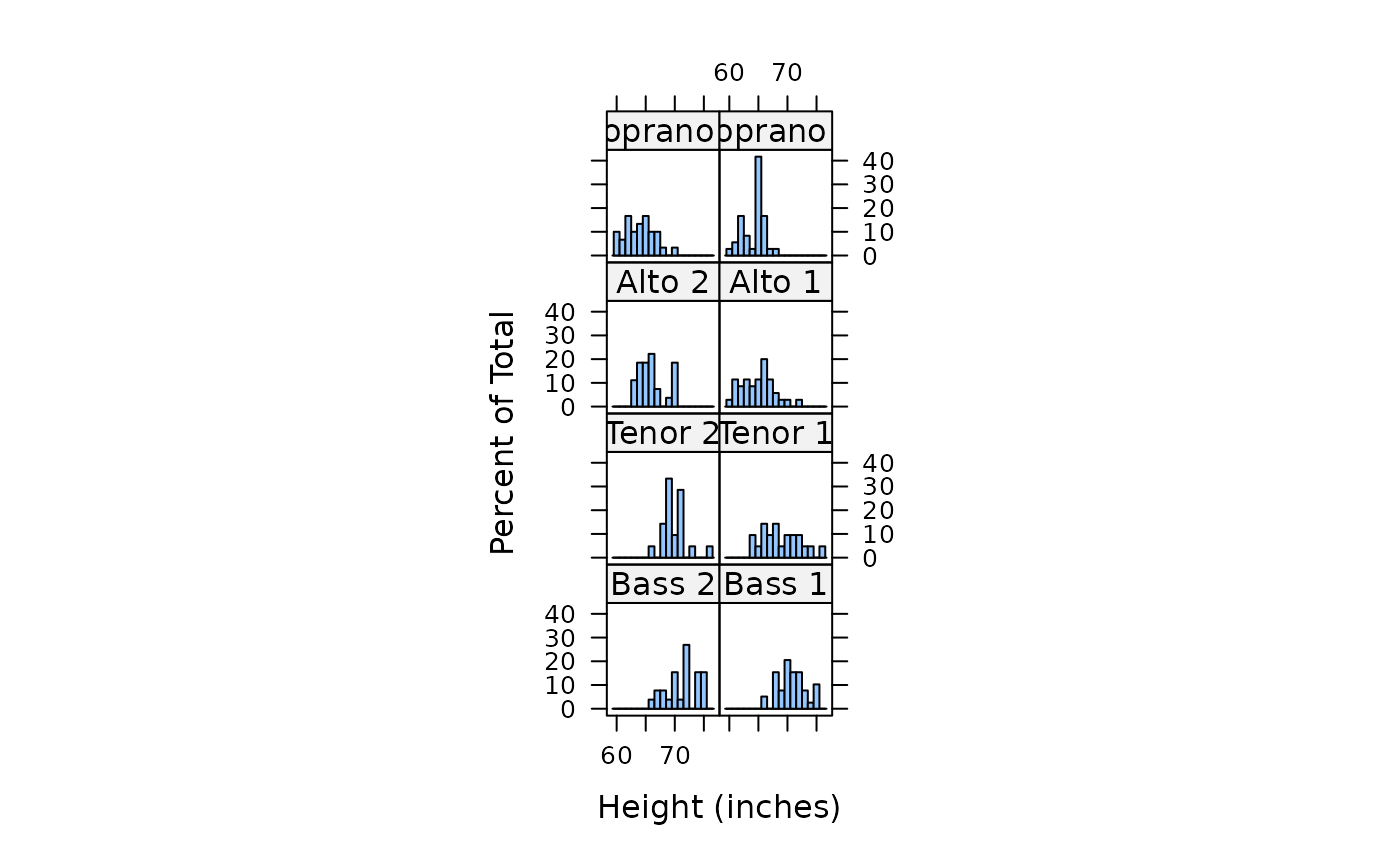 histogram( ~ height | voice.part, data = singer, nint = 17,