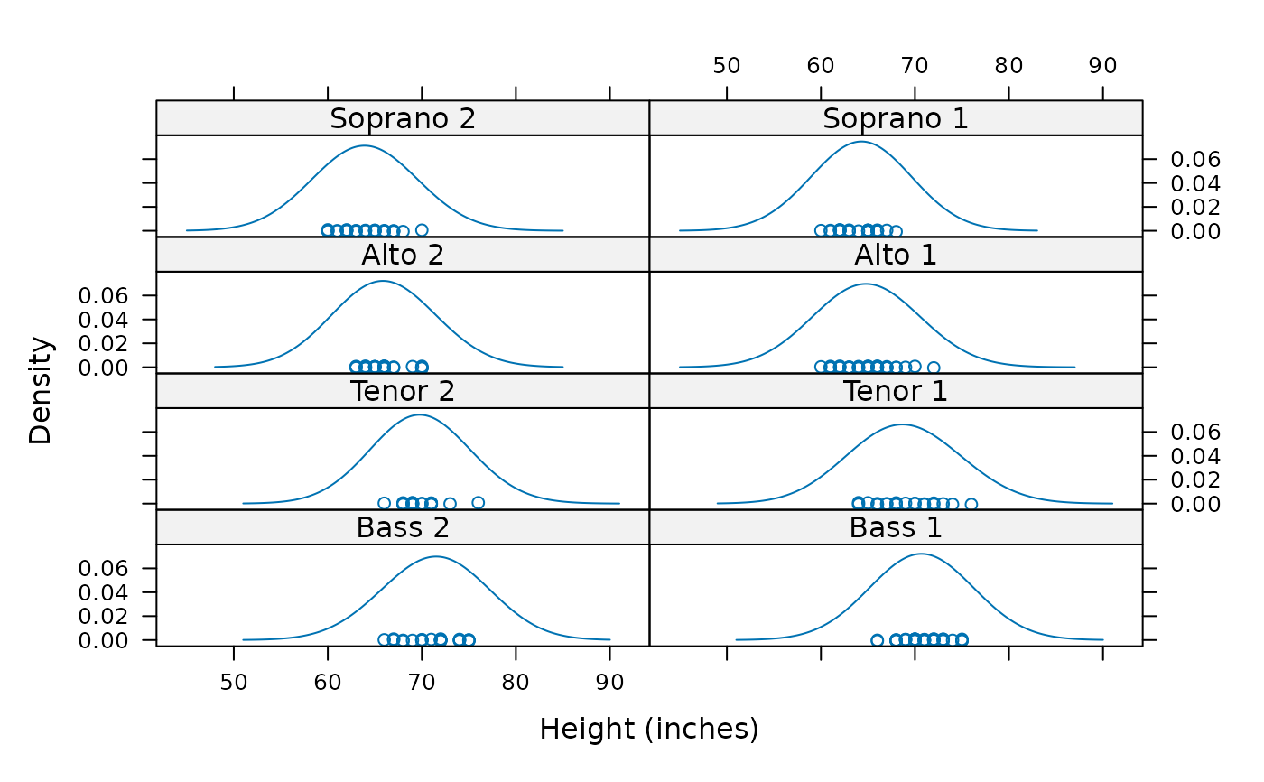 densityplot( ~ height | voice.part, data = singer, layout = c(2, 4),