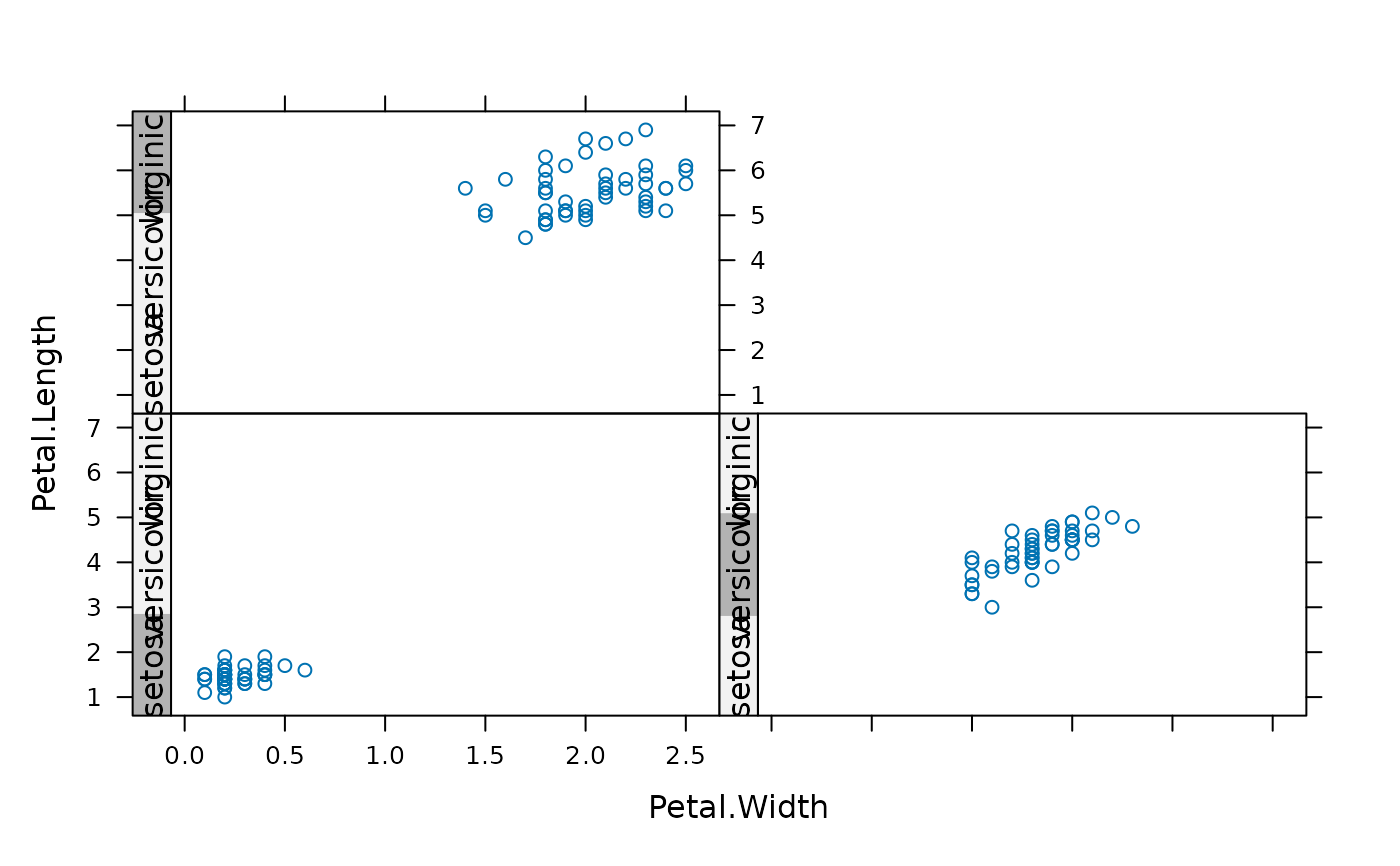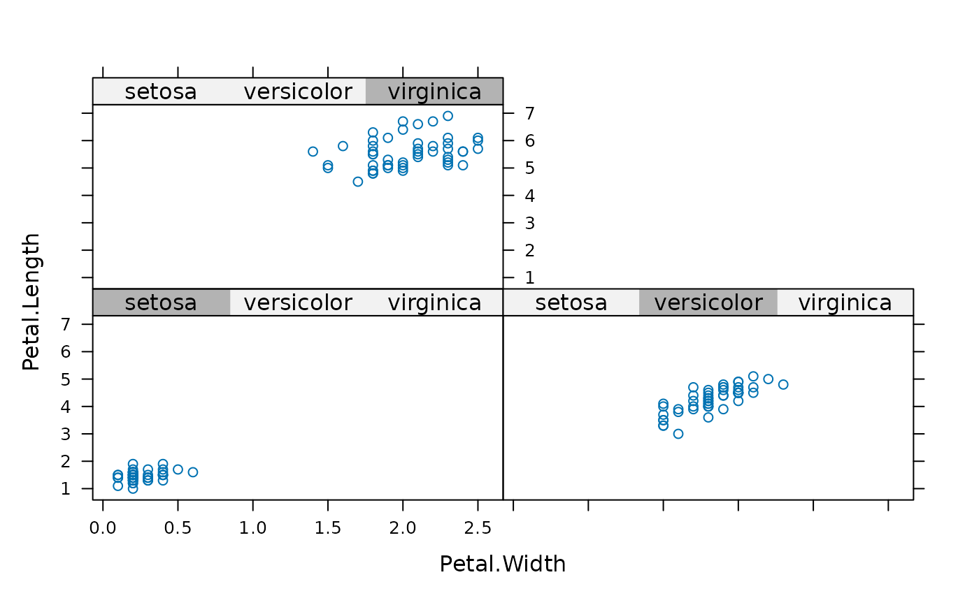 xyplot(Petal.Length ~ Petal.Width | Species, iris,