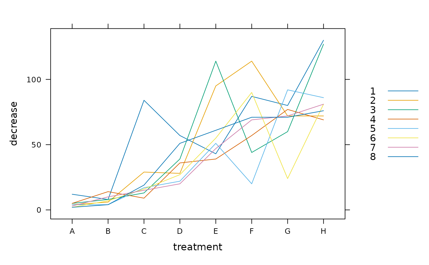 xyplot(decrease ~ treatment, OrchardSprays, groups = rowpos,