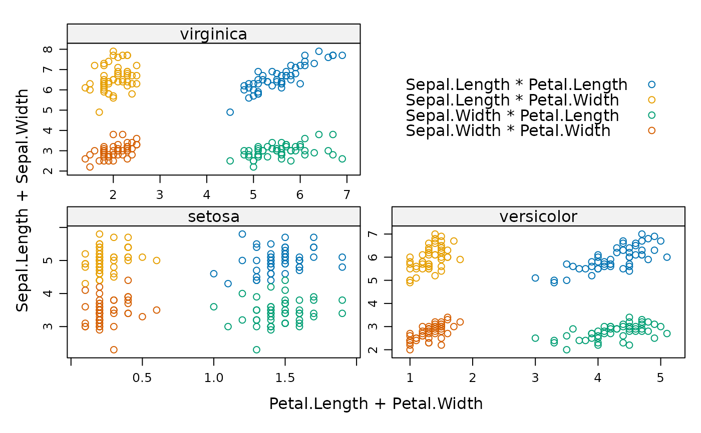 xyplot(Sepal.Length + Sepal.Width ~ Petal.Length + Petal.Width | Species,