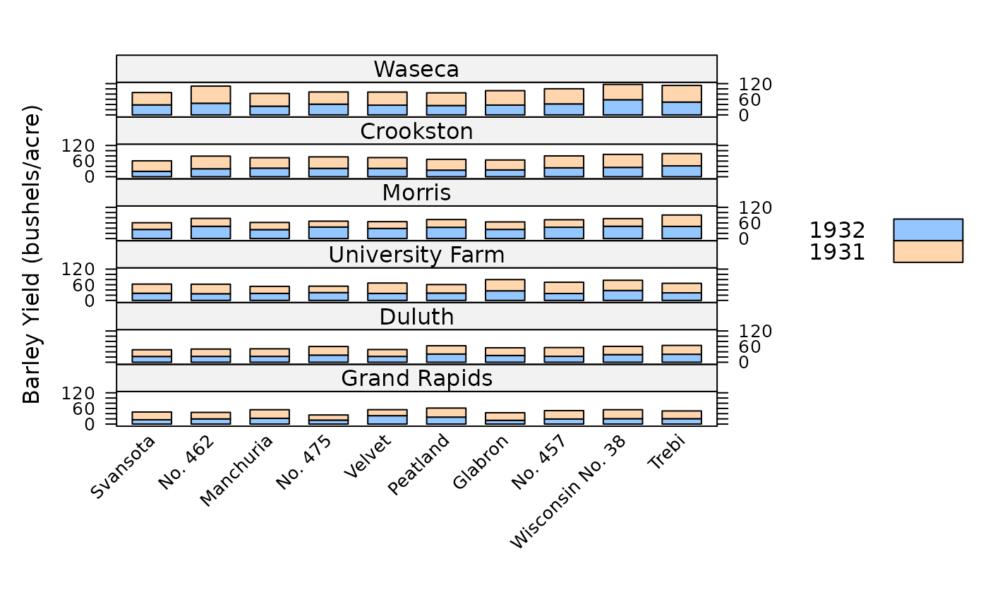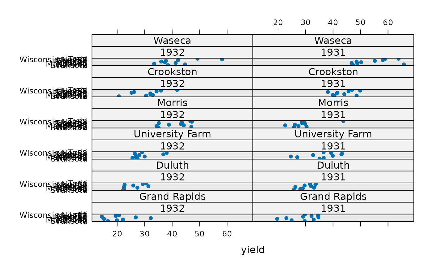 dotplot(variety ~ yield | site, data = barley, groups = year,