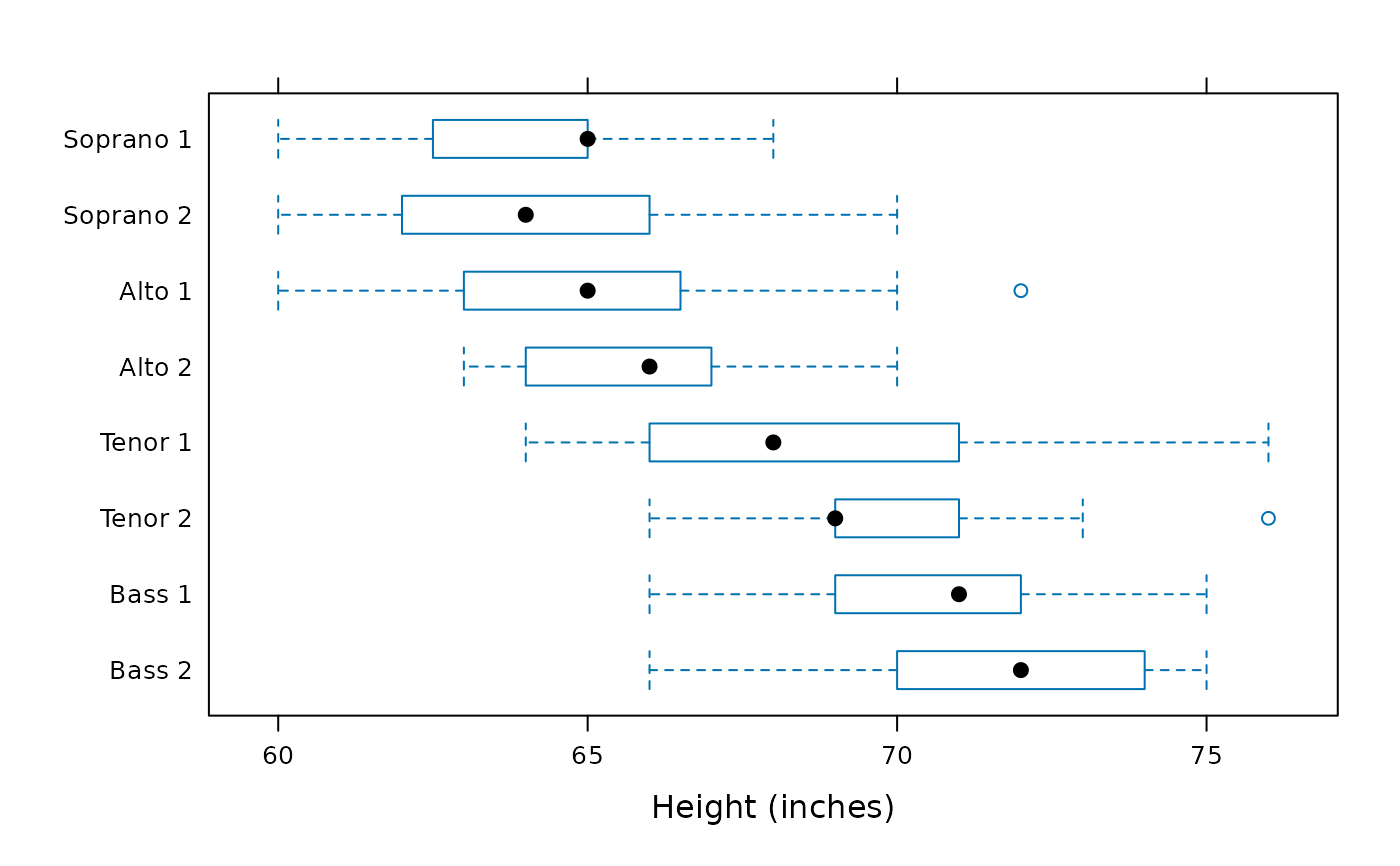 bwplot(voice.part ~ height, data = singer, xlab = "Height (inches)")