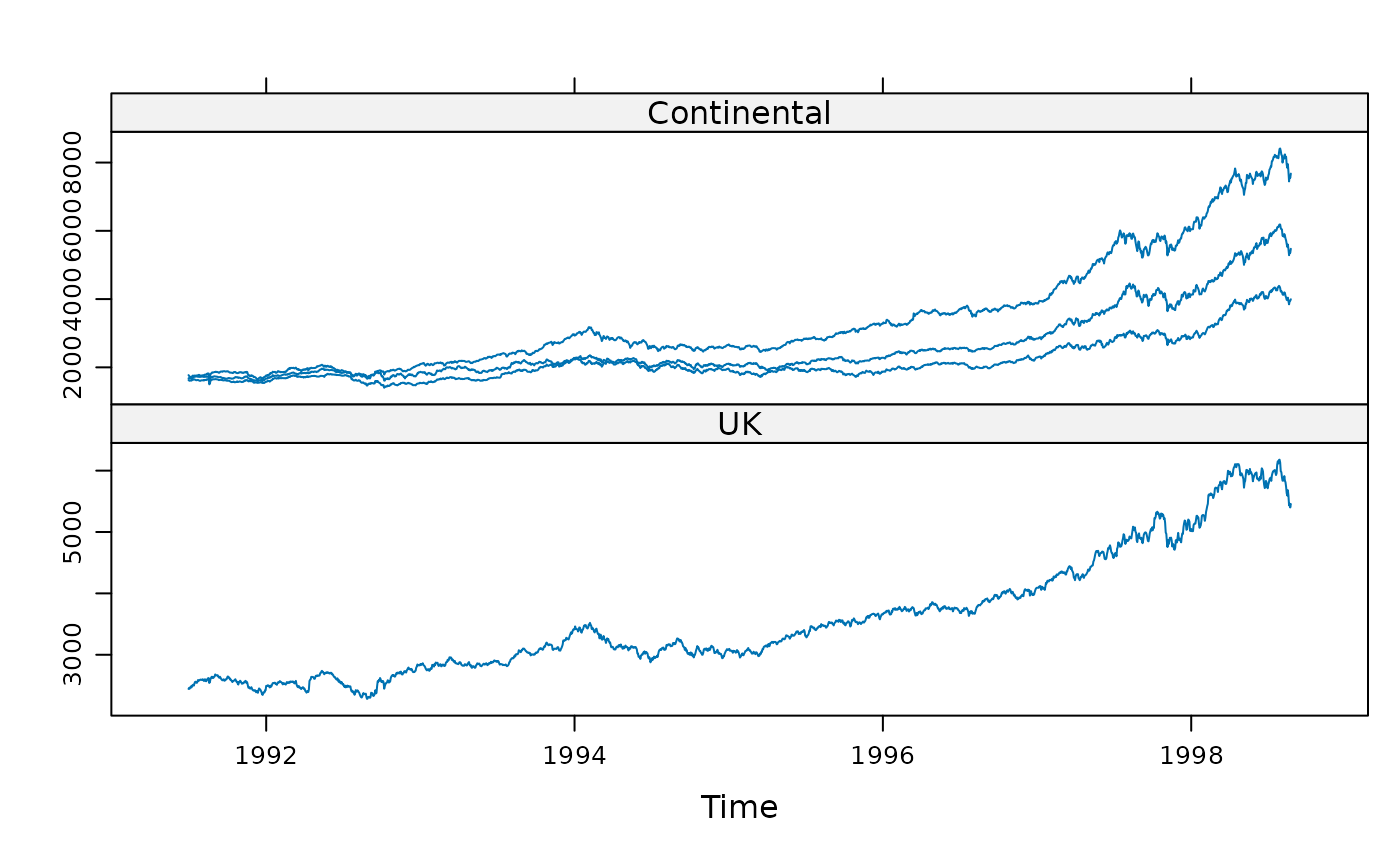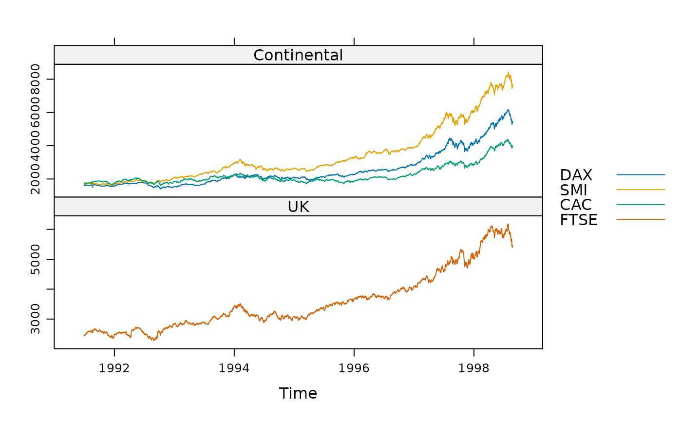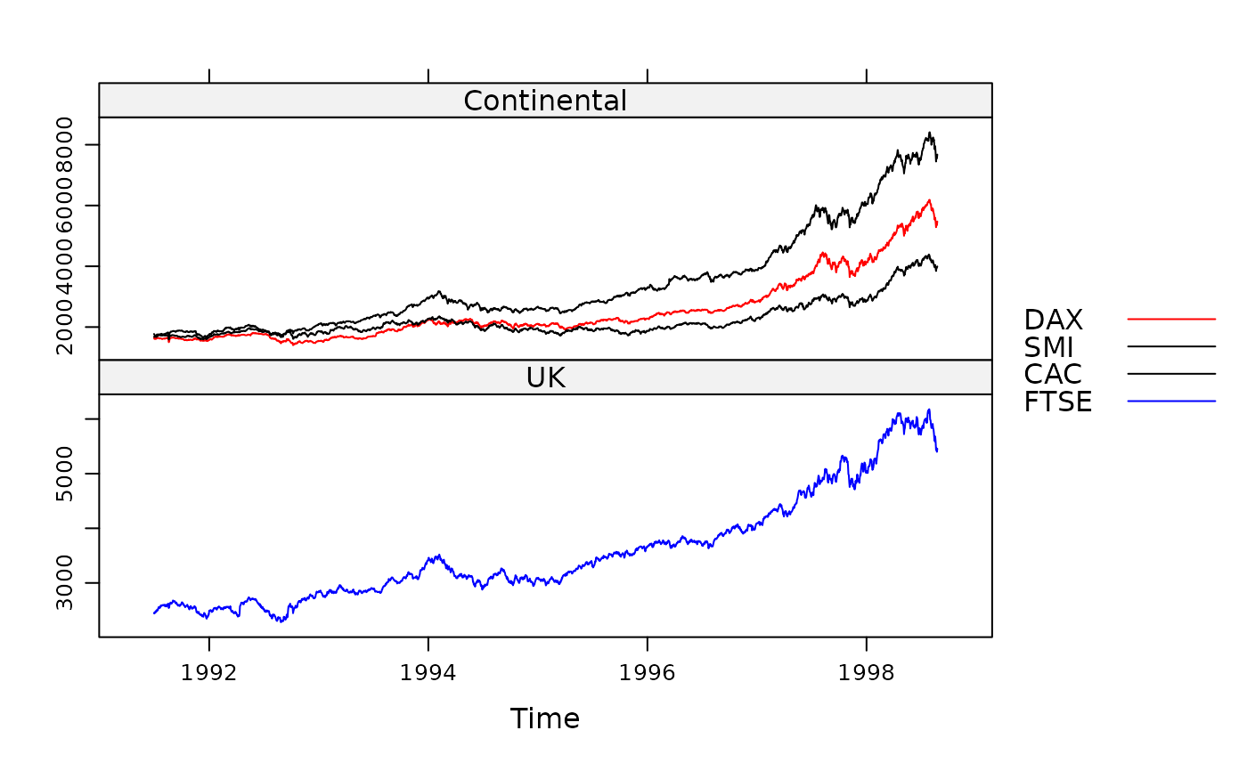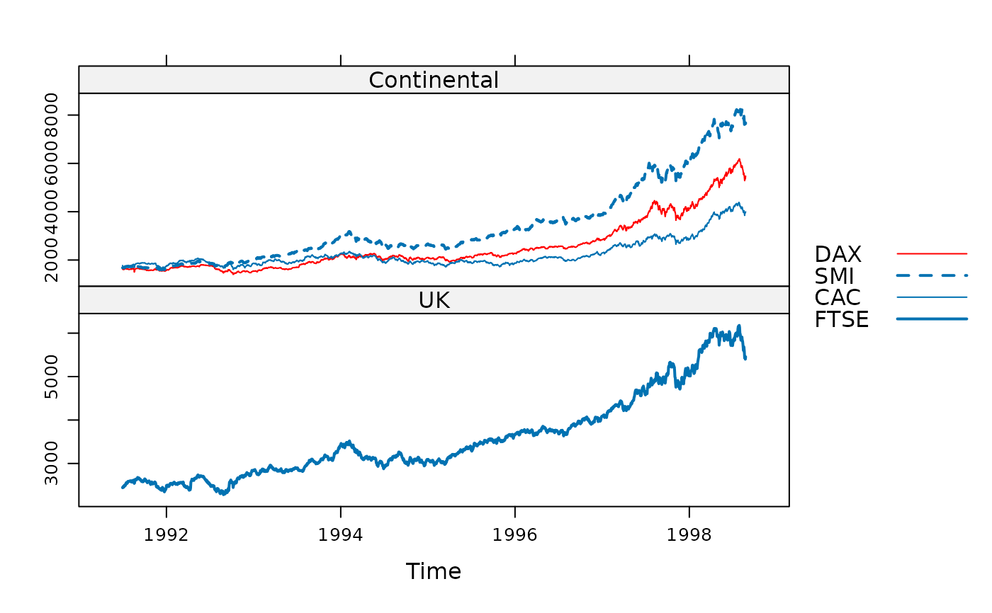 xyplot(EuStockMarkets, screens = list(FTSE = "UK", "Continental"))