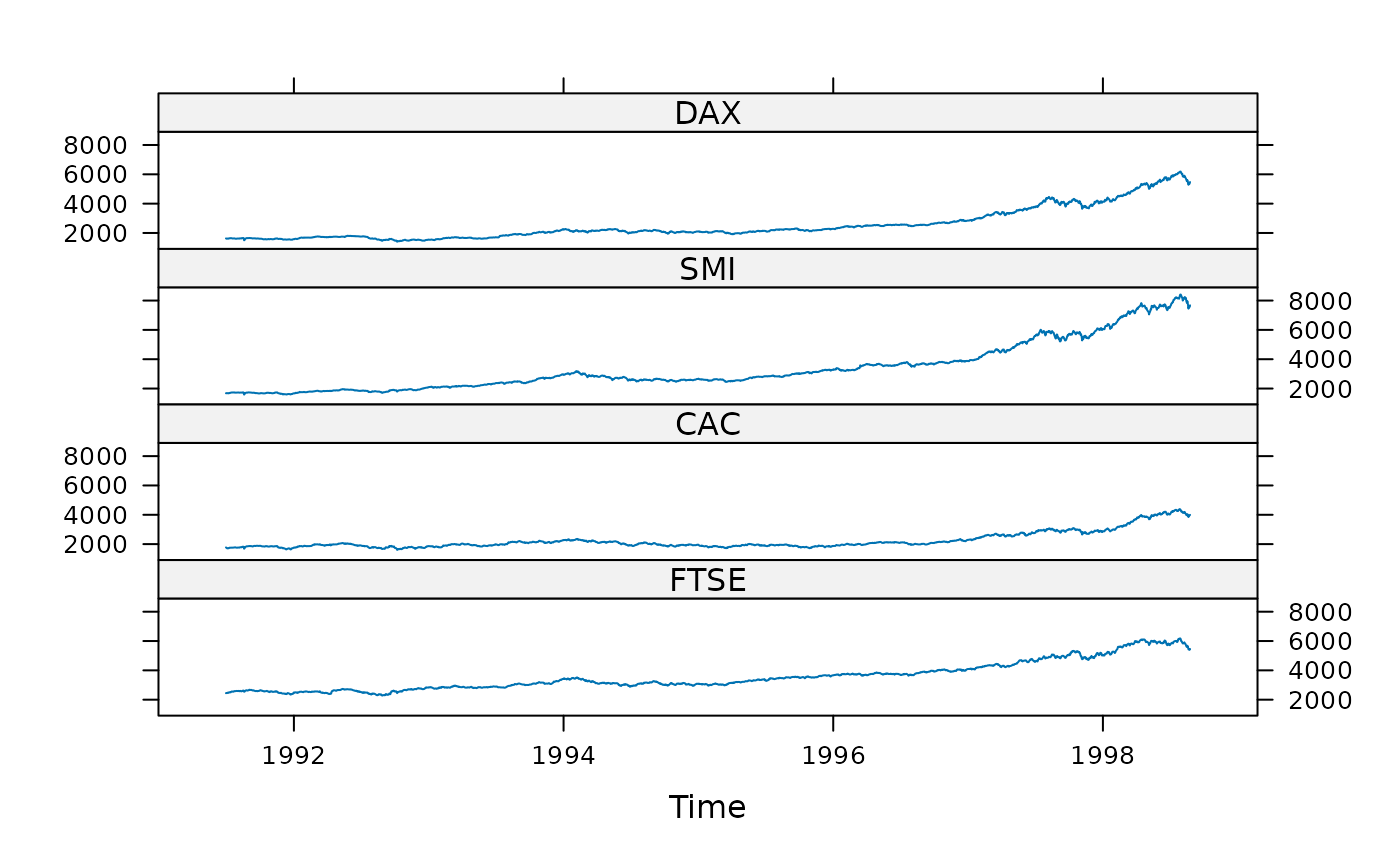 xyplot(EuStockMarkets, scales = list(y = "same"))