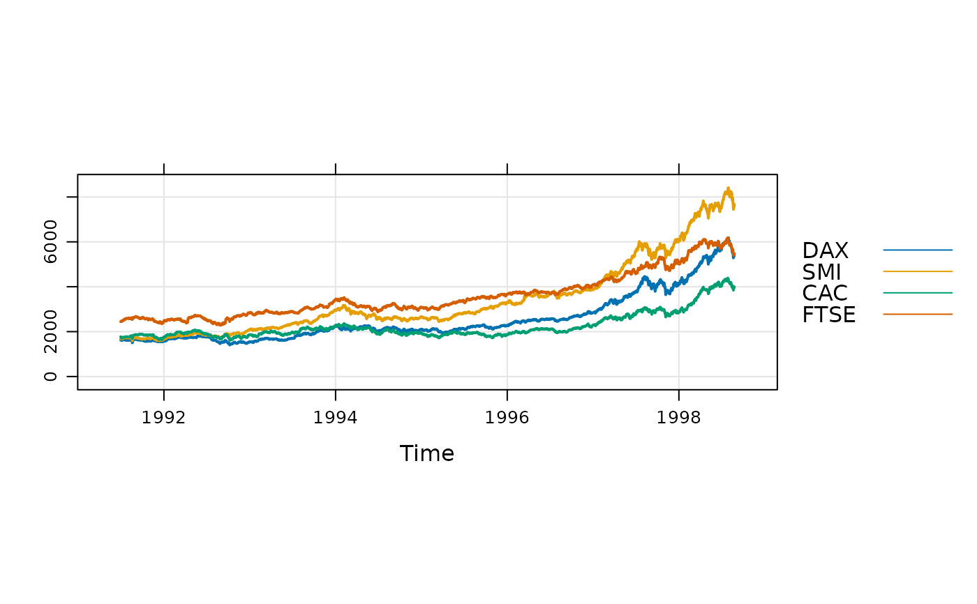 type = c("l","g"), ylim = c(0, max(EuStockMarkets)))