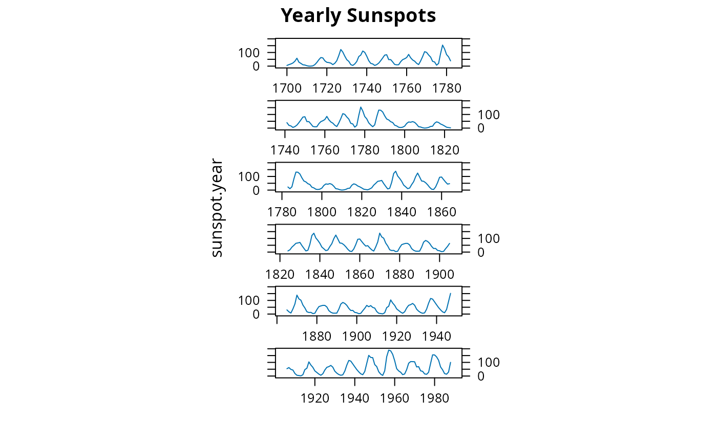 xyplot(sunspot.year ~ time(sunspot.year) | equal.count(time(sunspot.year)),