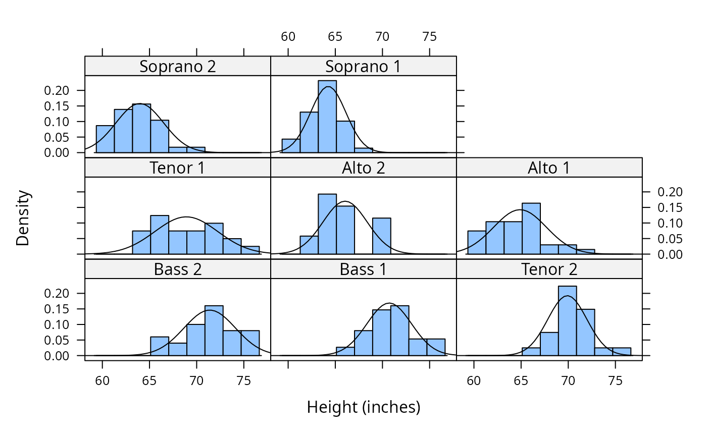 histogram( ~ height | voice.part, data = singer, nint = 17,