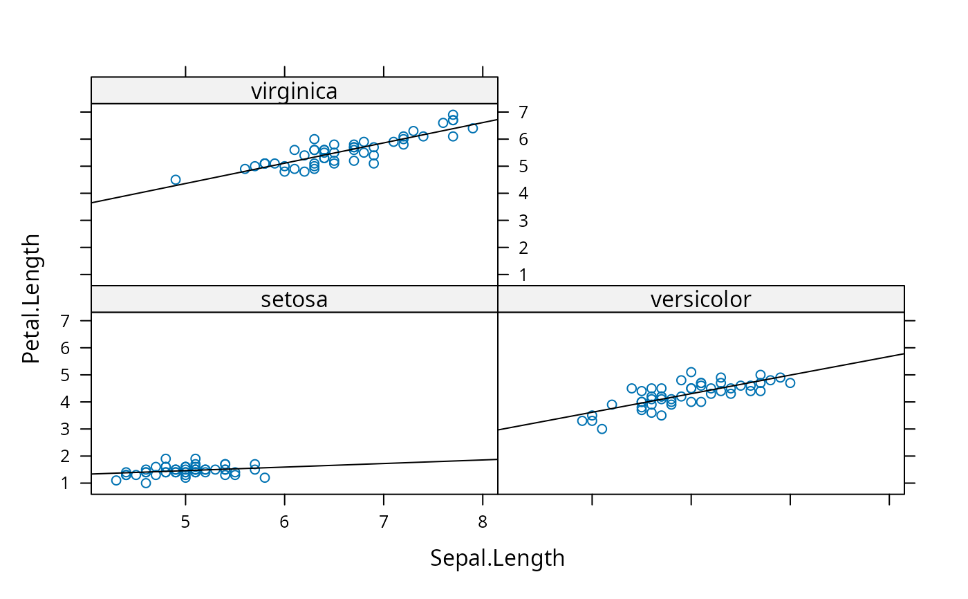 xyplot(Petal.Length ~ Sepal.Length | Species, iris, layout = c(2, 2))