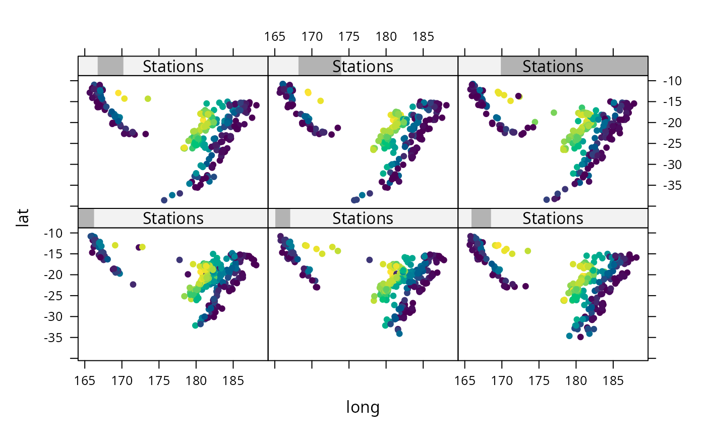xyplot(lat ~ long | equal.count(stations), quakes,