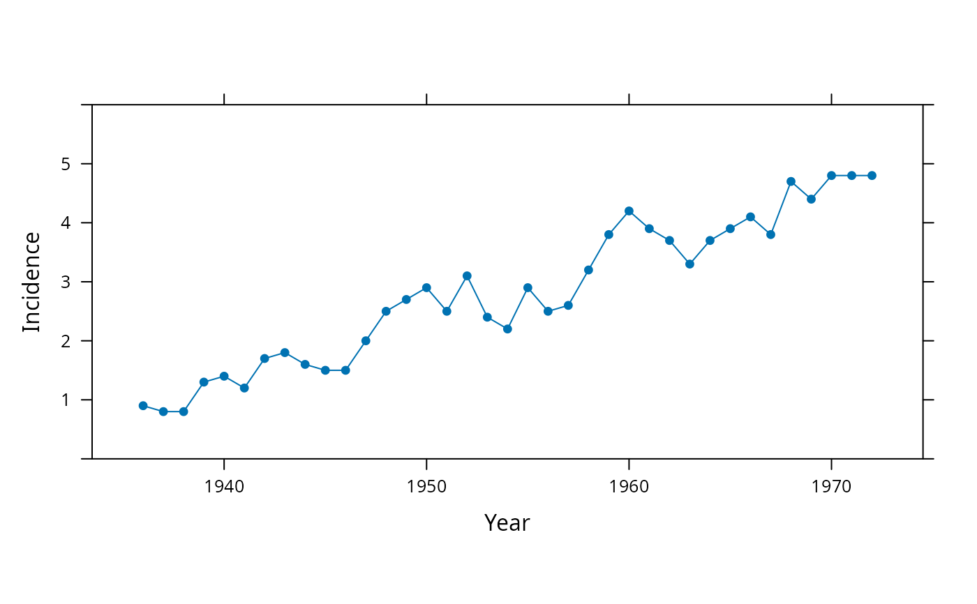melanoma.RdThese data from the Connecticut Tumor Registry present age-adjusted numbers of melanoma skin-cancer incidences per 100,000 people in Connectict for the years from 1936 to 1972.