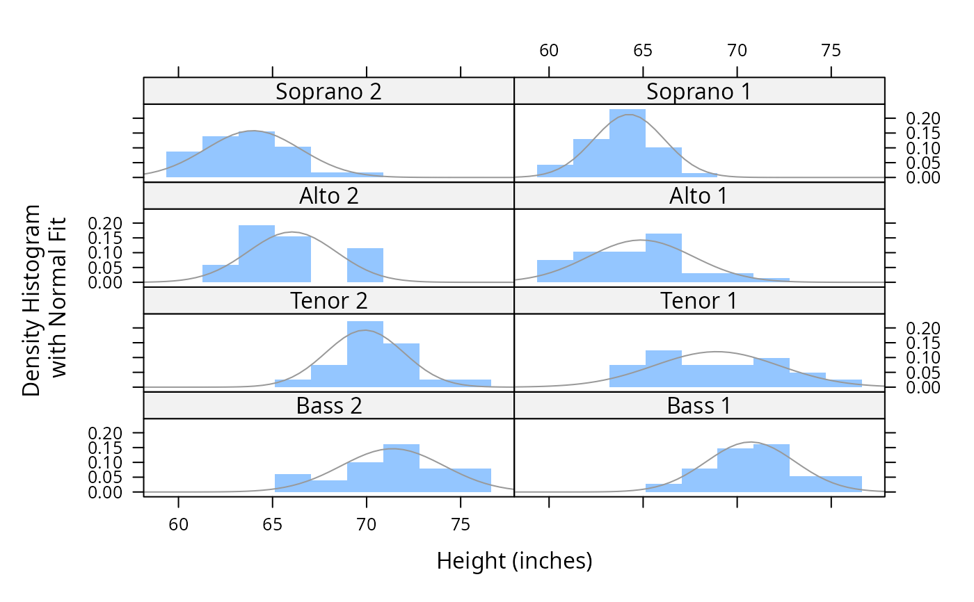 histogram( ~ height | voice.part, data = singer, layout = c(2, 4),