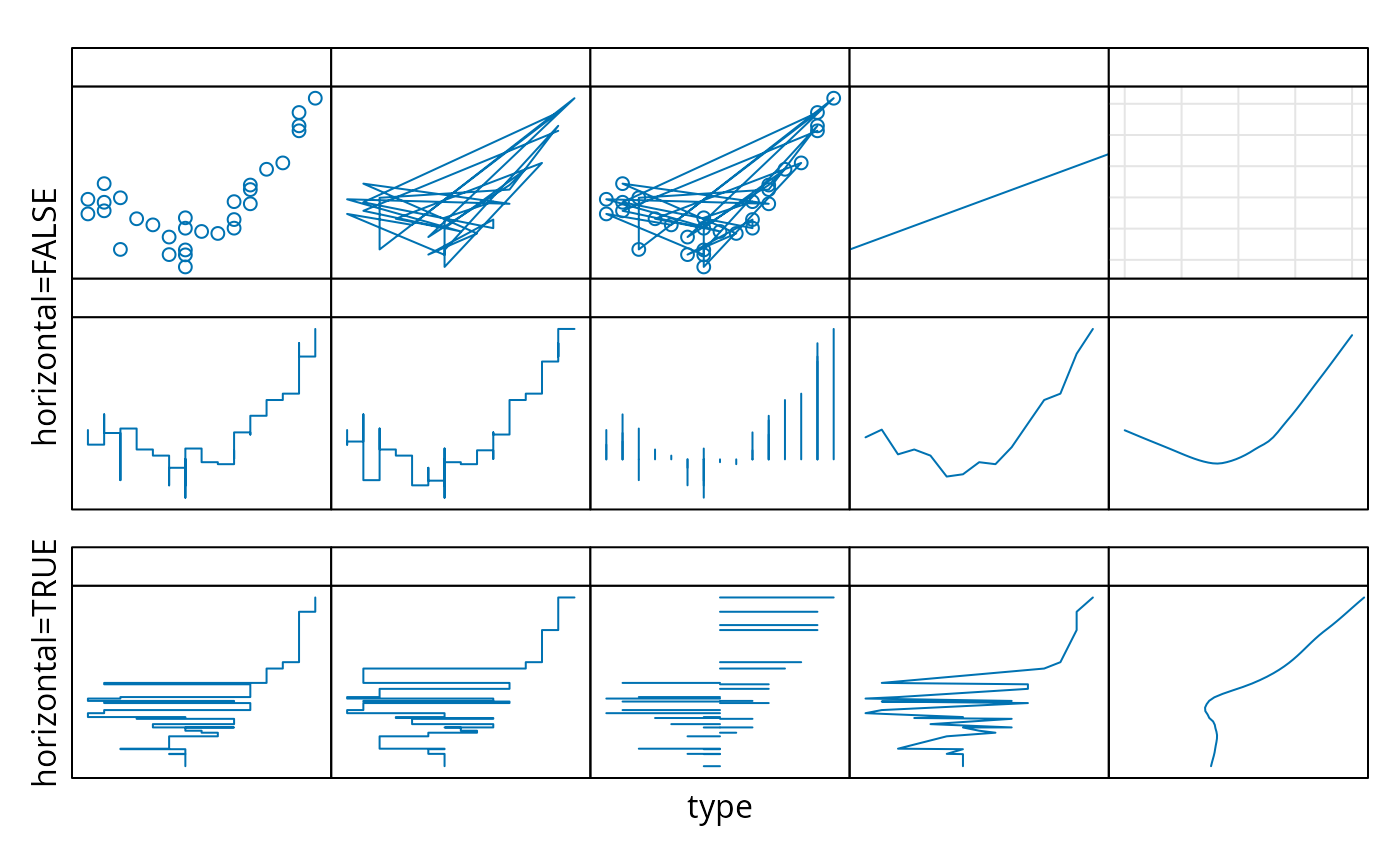 typeis similar to the effect of the correspondingtypeinplot:"p"and"l"stand for points and lines respectively;"b"and"o"(for ‘overlay’) plot both;"h"draws vertical (or horizontal ifhorizontal = TRUE) line segments from the points to the origin. Types"s"and"S"are like"l"in the sense that they join consecutive points, but instead of being joined by a straight line, points are connected by a vertical and a horizontal segment forming a ‘step’, with the vertical segment coming first for"s", and the horizontal segment coming first for"S". Types"s"and"S"sort the values along one of the axes (depending onhorizontal); this is unlike the behavior inplot. For the latter behavior, usetype = "s"withpanel = panel.points.Type
