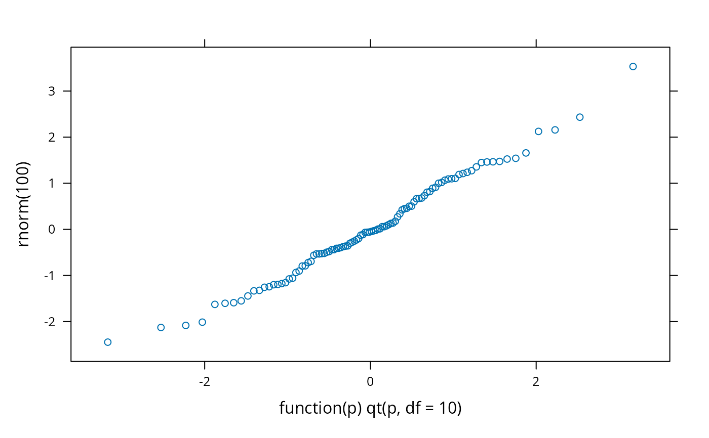 qqmath(~ rnorm(100), distribution = function(p) qt(p, df = 10))