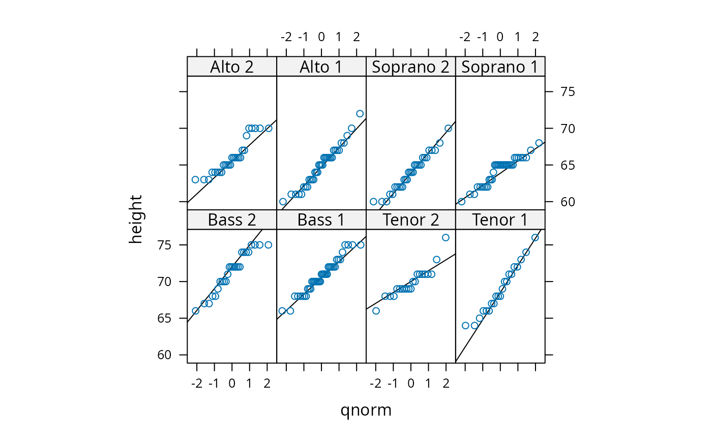 qqmath(~ height | voice.part, aspect = "xy", data = singer,