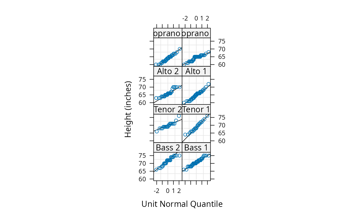 singer.RdHeights in inches of the singers in the New York Choral Society in 1979. The data are grouped according to voice part. The vocal range for each voice part increases in pitch according to the following order: Bass 2, Bass 1, Tenor 2, Tenor 1, Alto 2, Alto 1, Soprano 2, Soprano 1.