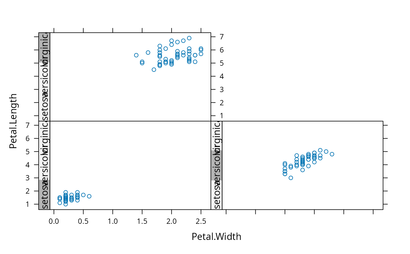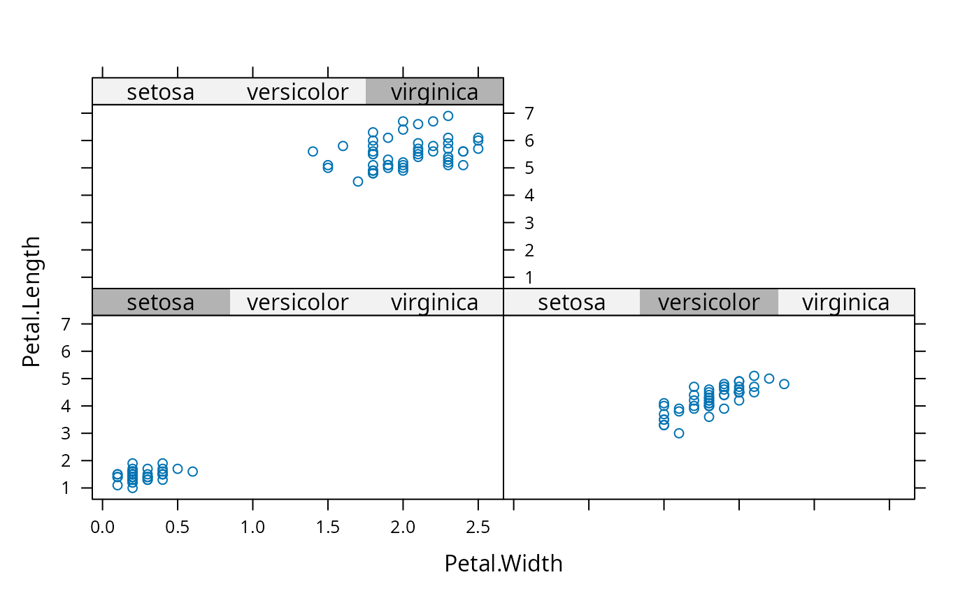 xyplot(Petal.Length ~ Petal.Width | Species, iris,