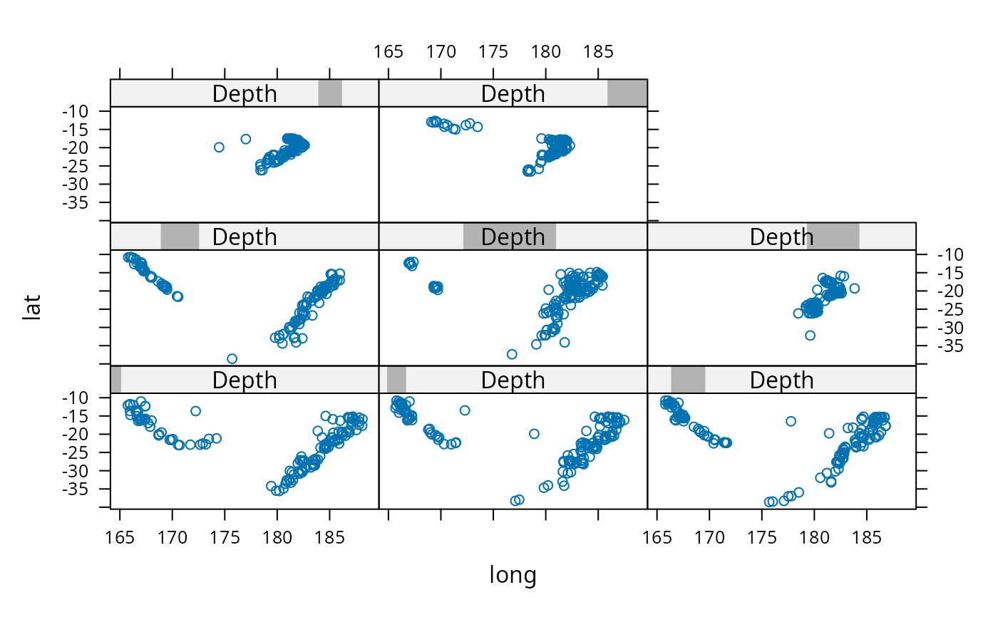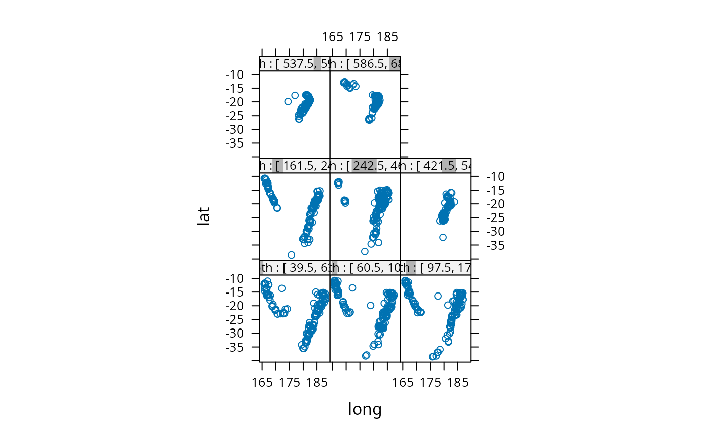 xyplot(lat ~ long | Depth, data = quakes)