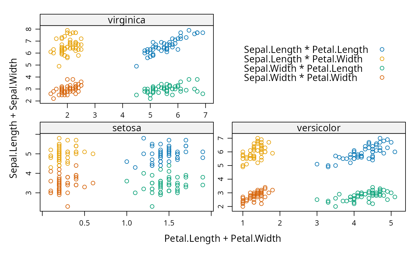 outerargument is set toTRUE. In that case, the plots are not superposed in each panel, but instead separated into different panels (as if a new conditioning variable had been added).Primary variables: The