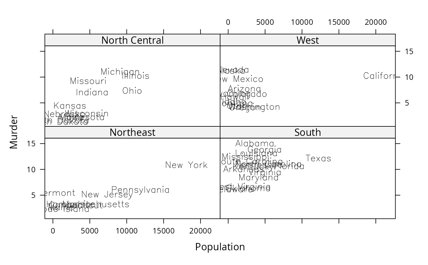 xyplot(Murder ~ Population | state.region, data = states,