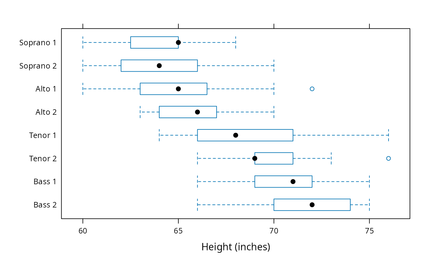 bwplot(voice.part ~ height, data = singer, xlab = "Height (inches)")