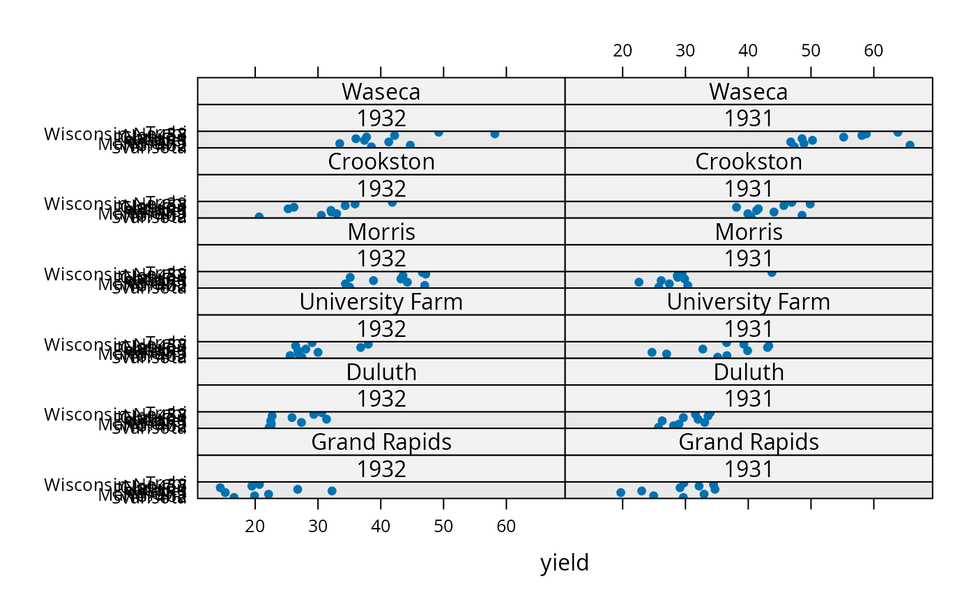dotplot(variety ~ yield | year * site, data=barley)