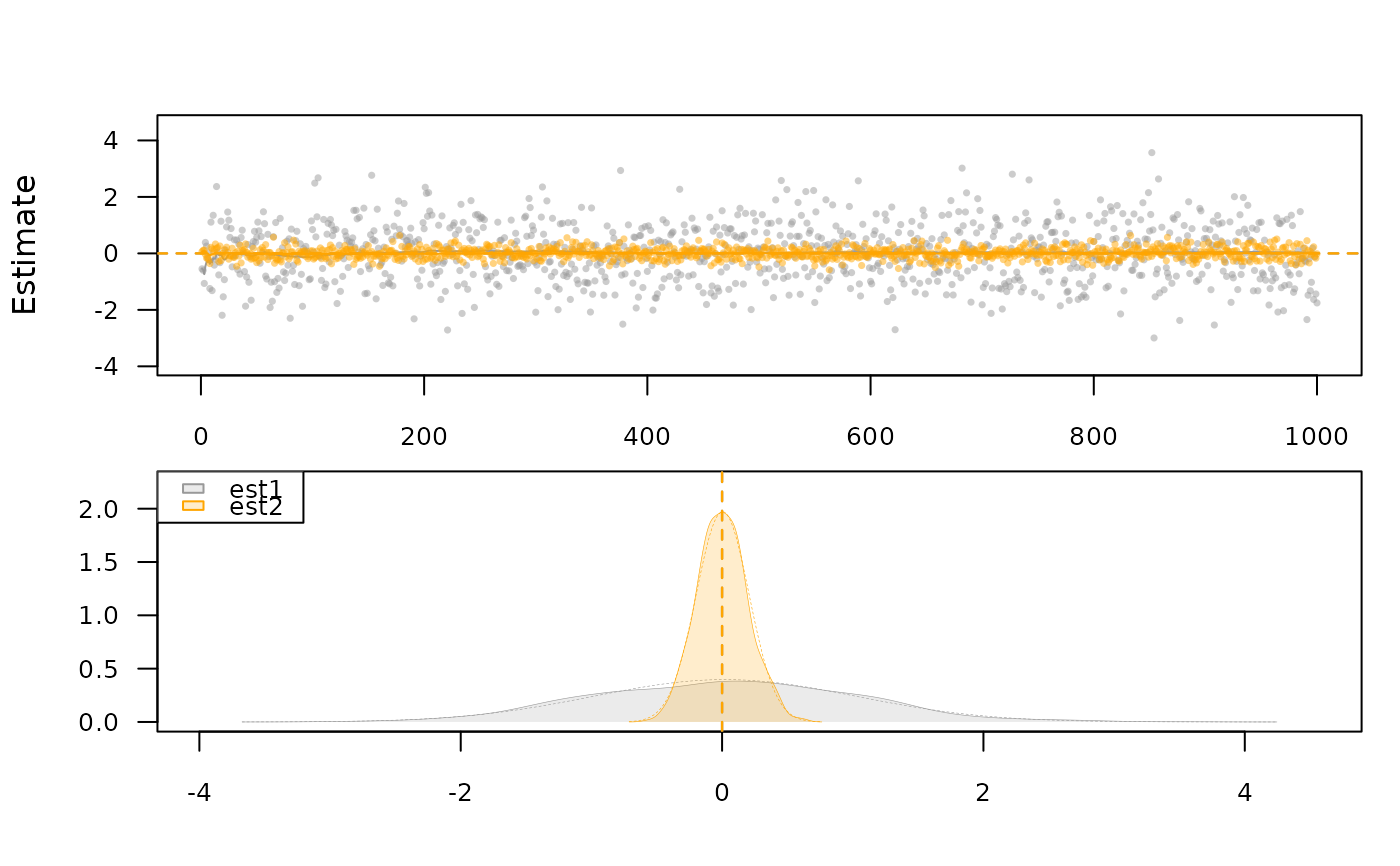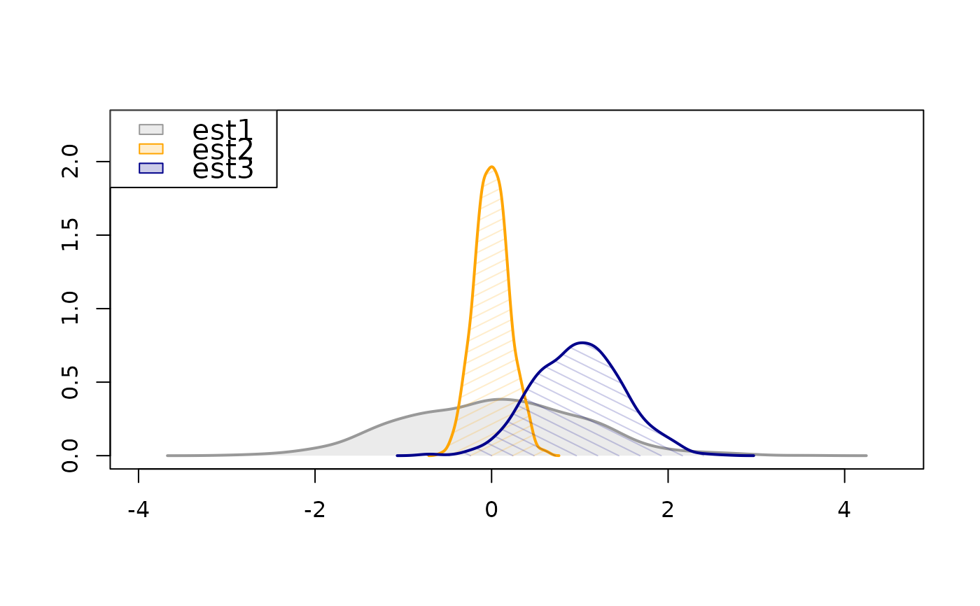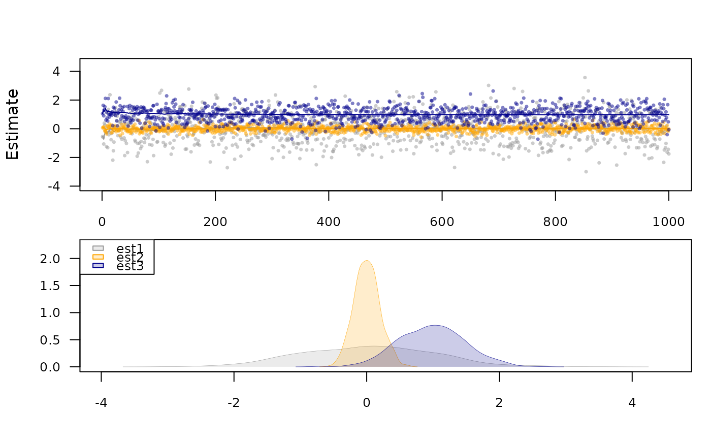 val <- cbind(est1=rnorm(n,sd=1),est2=rnorm(n,sd=0.2),est3=rnorm(n,1,sd=0.5),