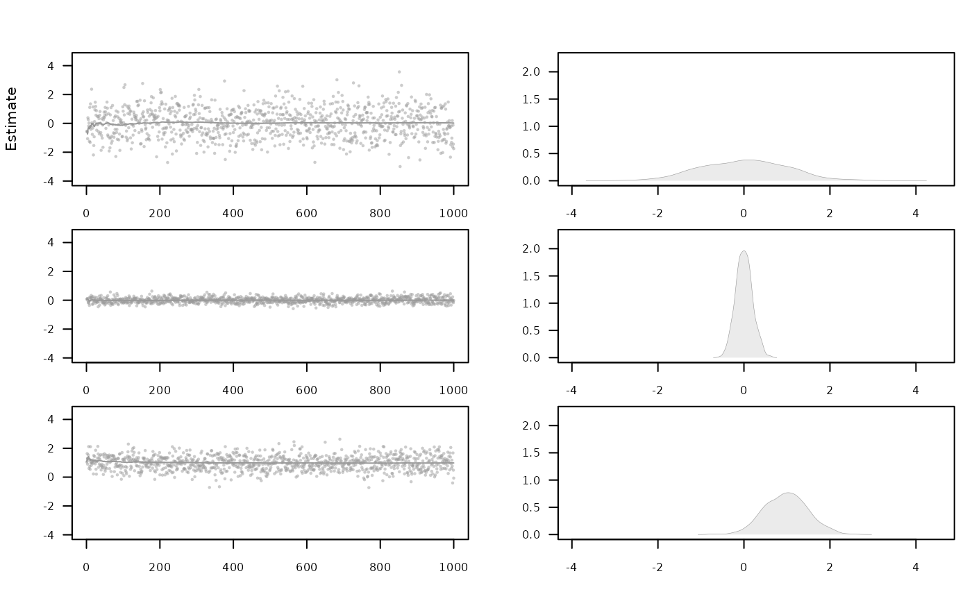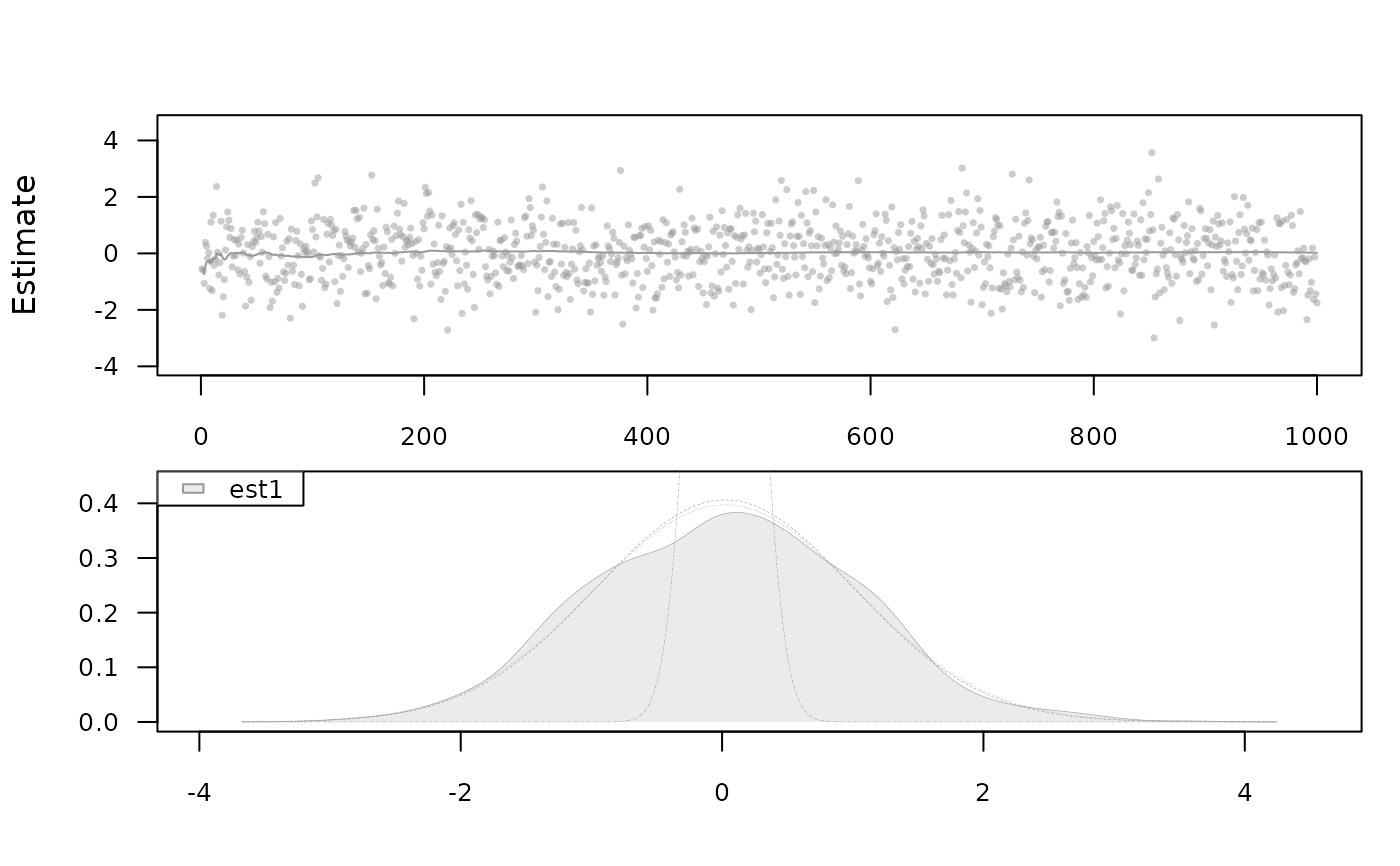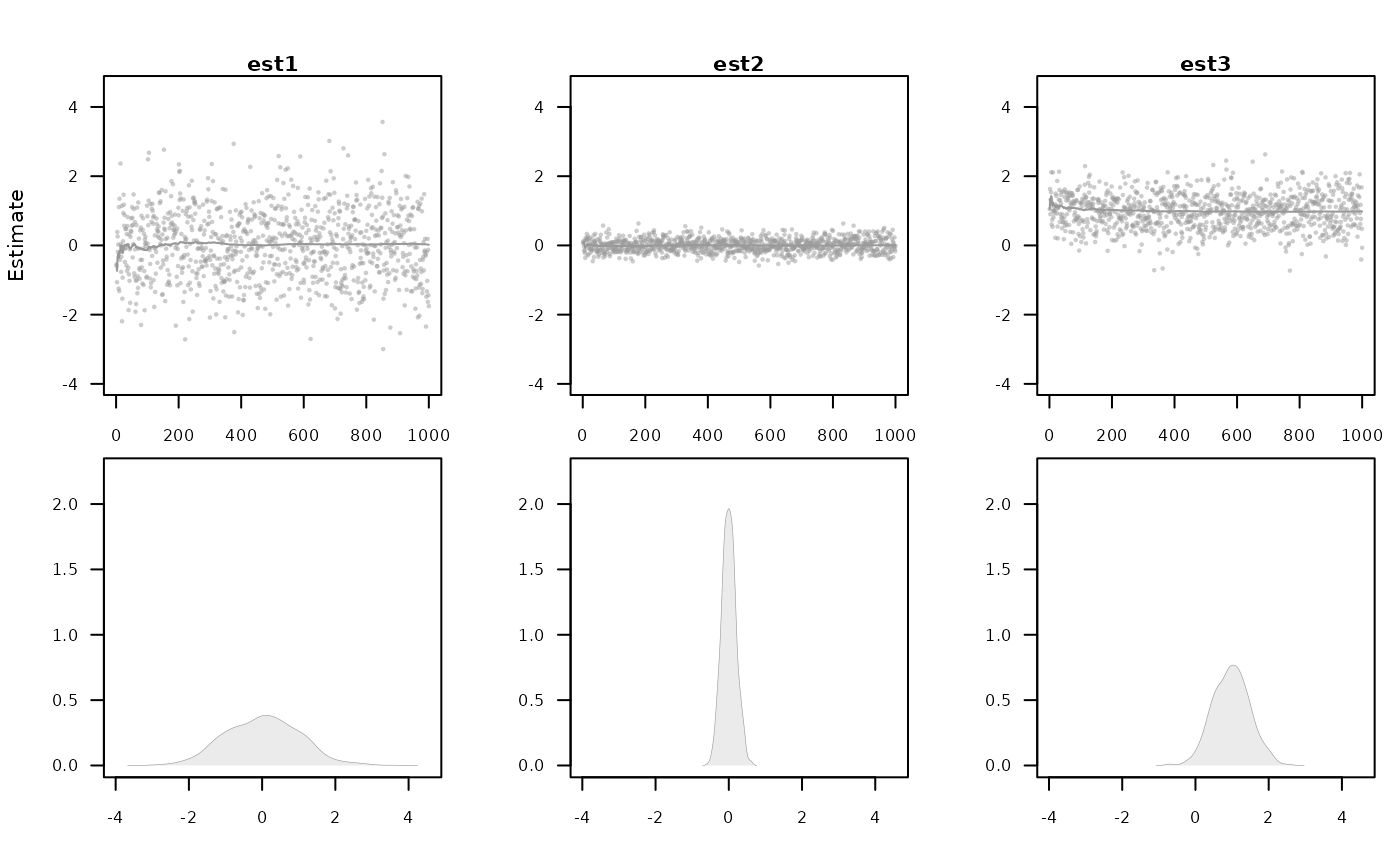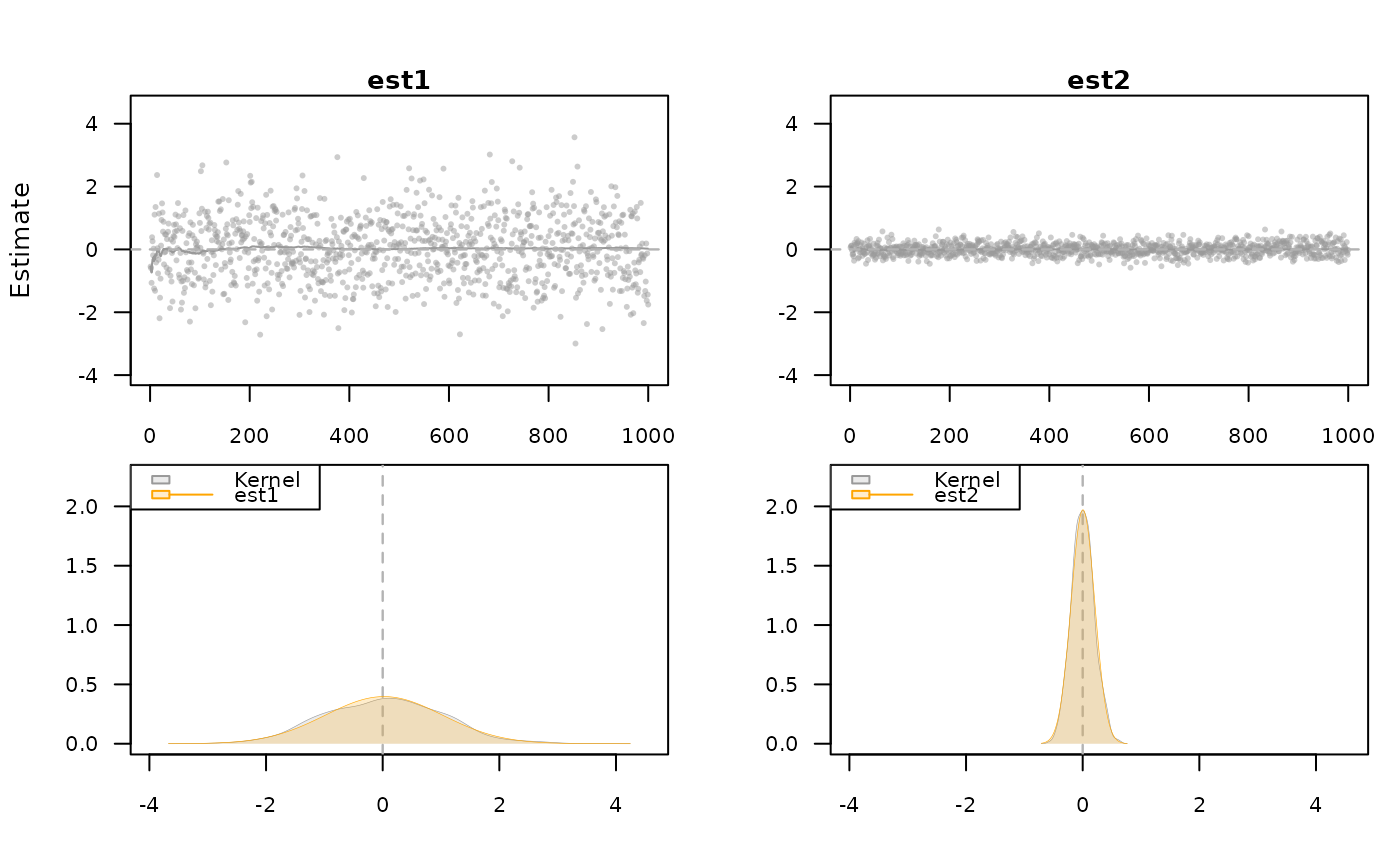 val <- cbind(est1=rnorm(n,sd=1),est2=rnorm(n,sd=0.2),est3=rnorm(n,1,sd=0.5),