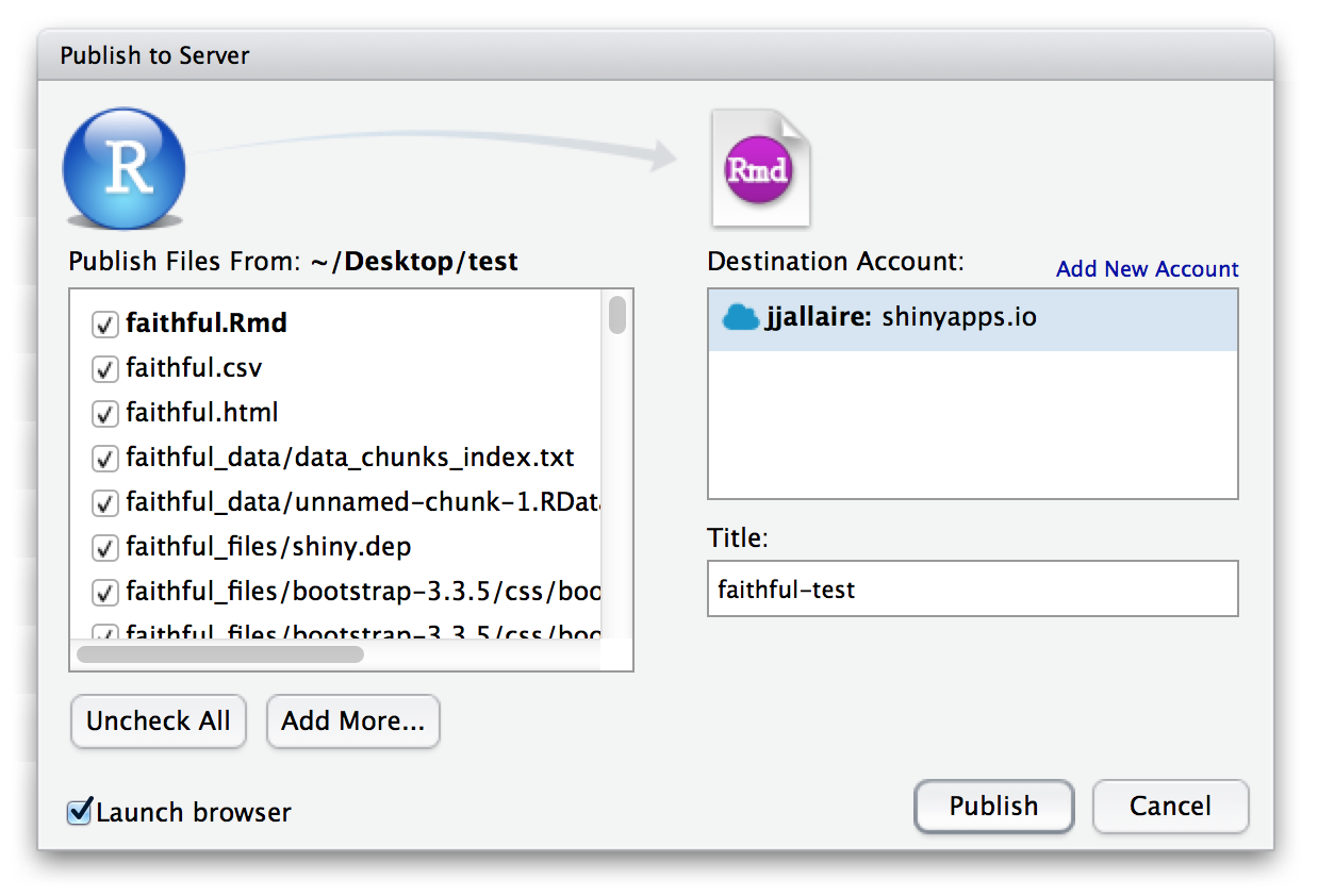For both of these methods, you can use the RStudio IDE’s integrated one-click publishing to publish directly from your desktop: