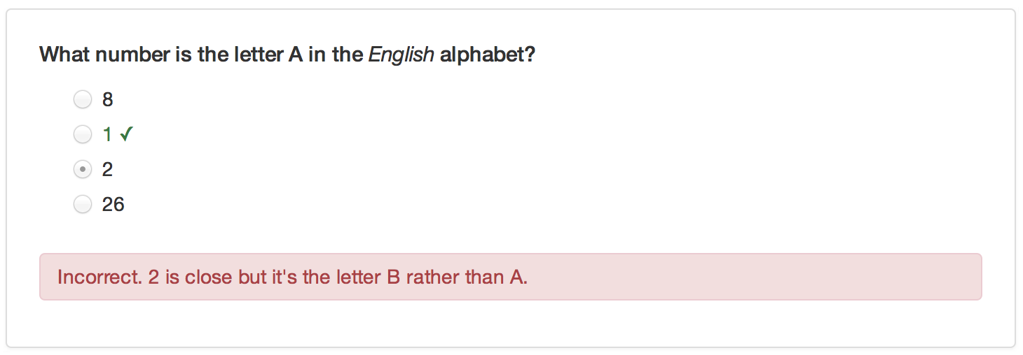 answer("2", message = "2 is close but it's the letter B rather than A."),