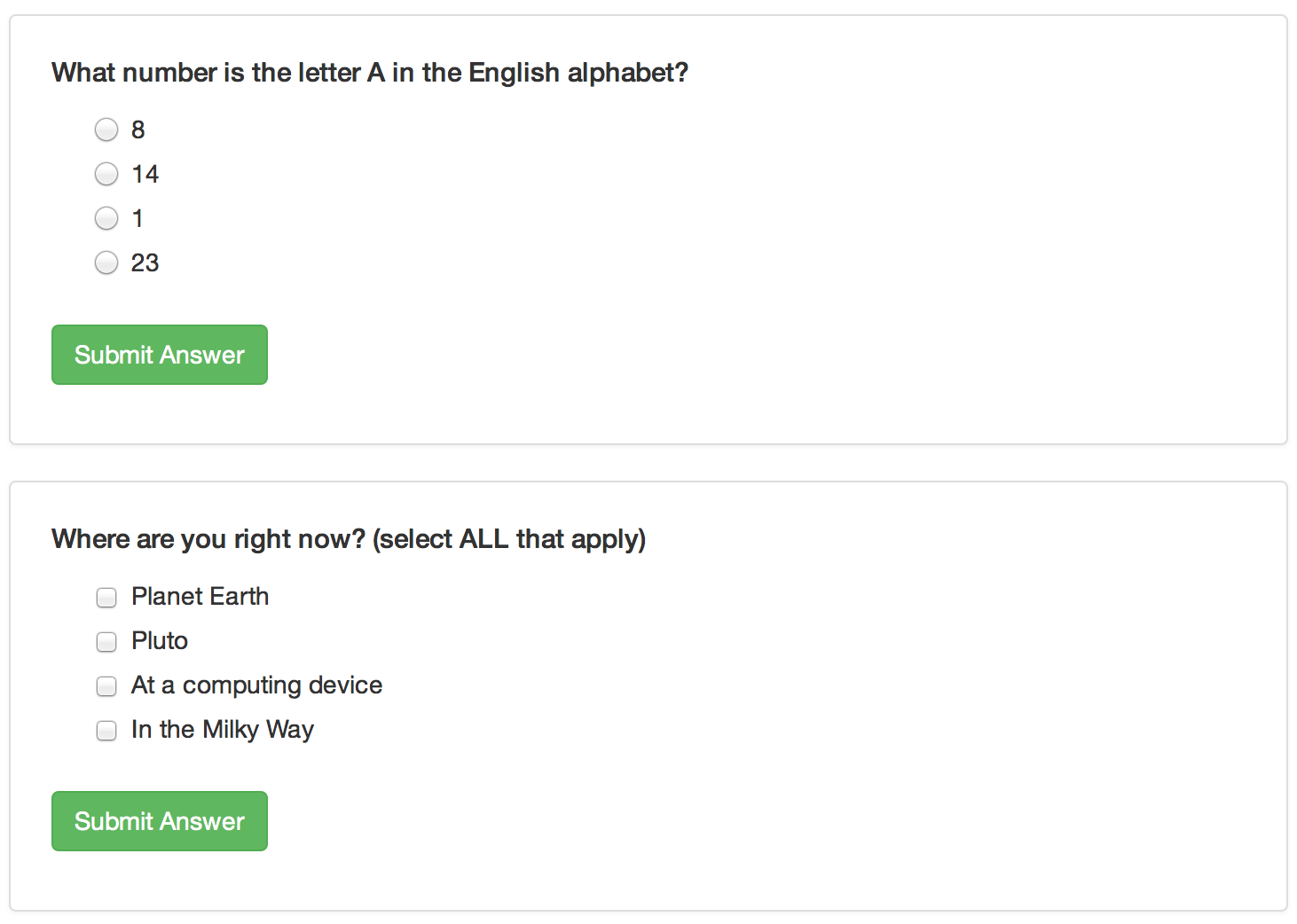 This is what the above example quiz questions would look like within a tutorial: