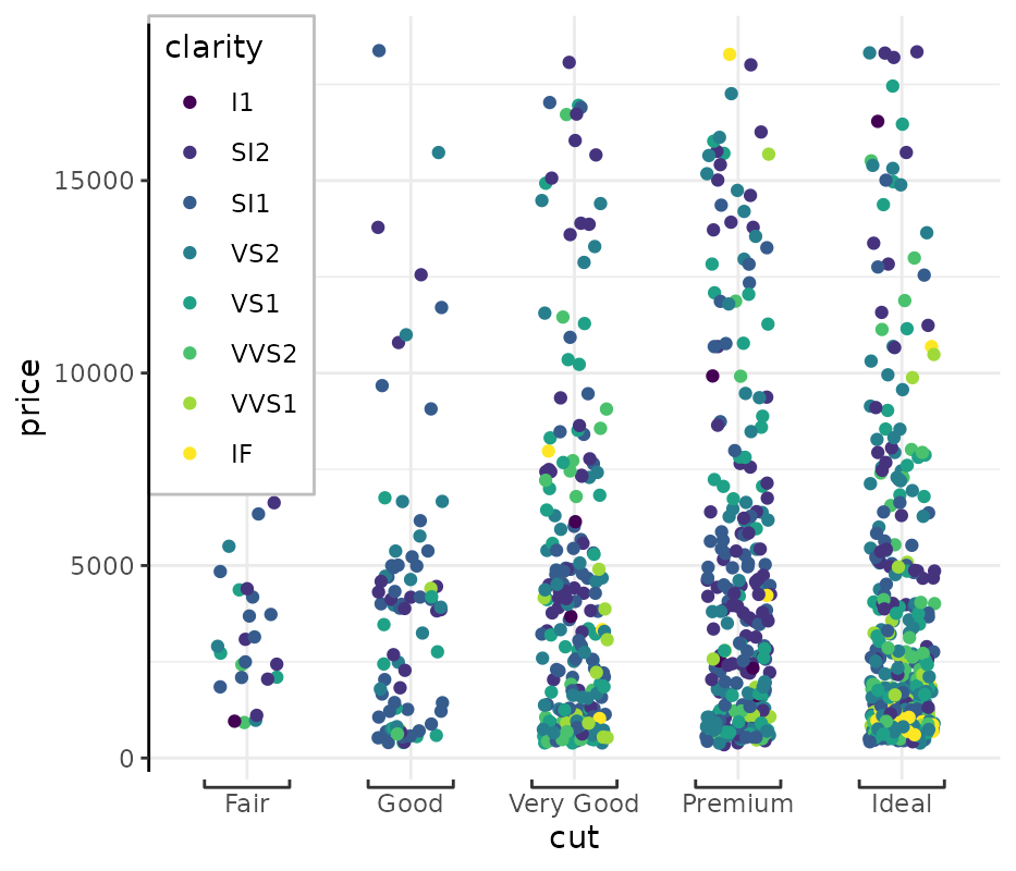 p <- ggplot(dsamp, aes(x=cut, y=price, colour=clarity)) + geom_point(position=position_jitter(width=0.2)) +