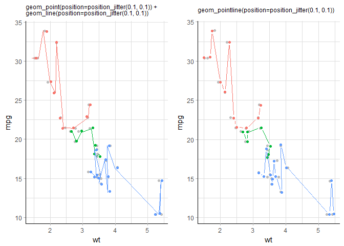 A geom that combines both points and lines. While possible by using both geom_point and geom_line, position adjustments are not preserved between the two layers. geom_pointline and geom_pointpath combines geom_point with geom_line and geom_path, respectively, while preserving position adjustments.