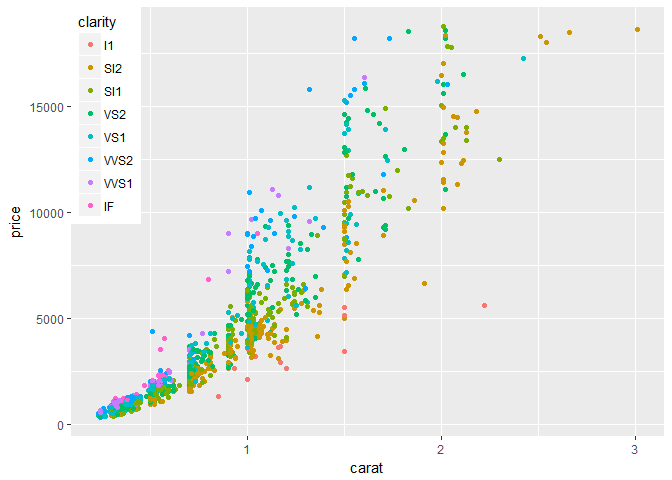 p1 <- qplot(carat, price, data = dsamp, colour = clarity)