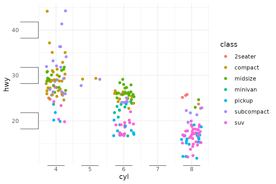 p <- ggplot(mpg, aes(cyl, hwy, colour=class)) +