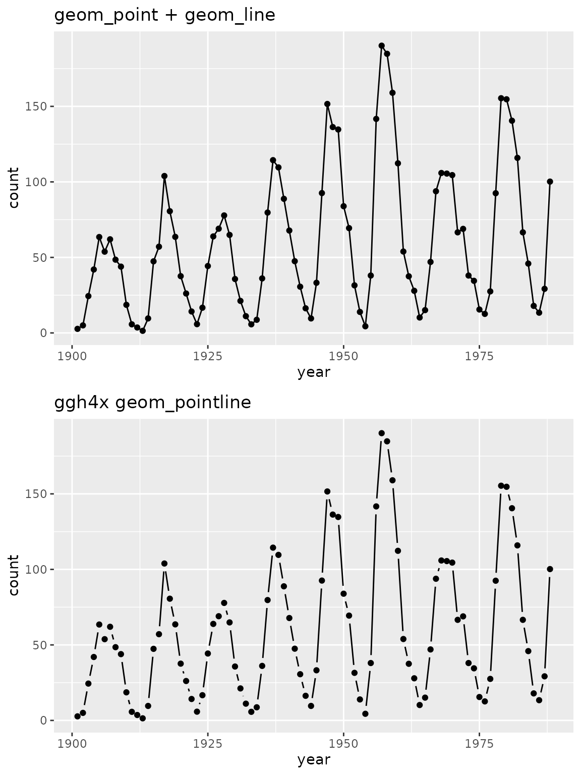 pointline <- ggplot(sunspots, aes(x = year, y = count)) + geom_pointpath(mult = 0.4) + labs(title = 'ggh4x geom_pointline')
