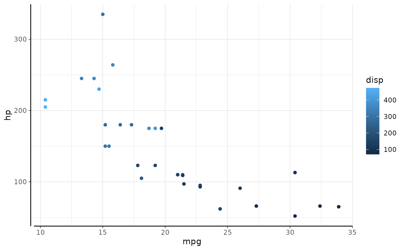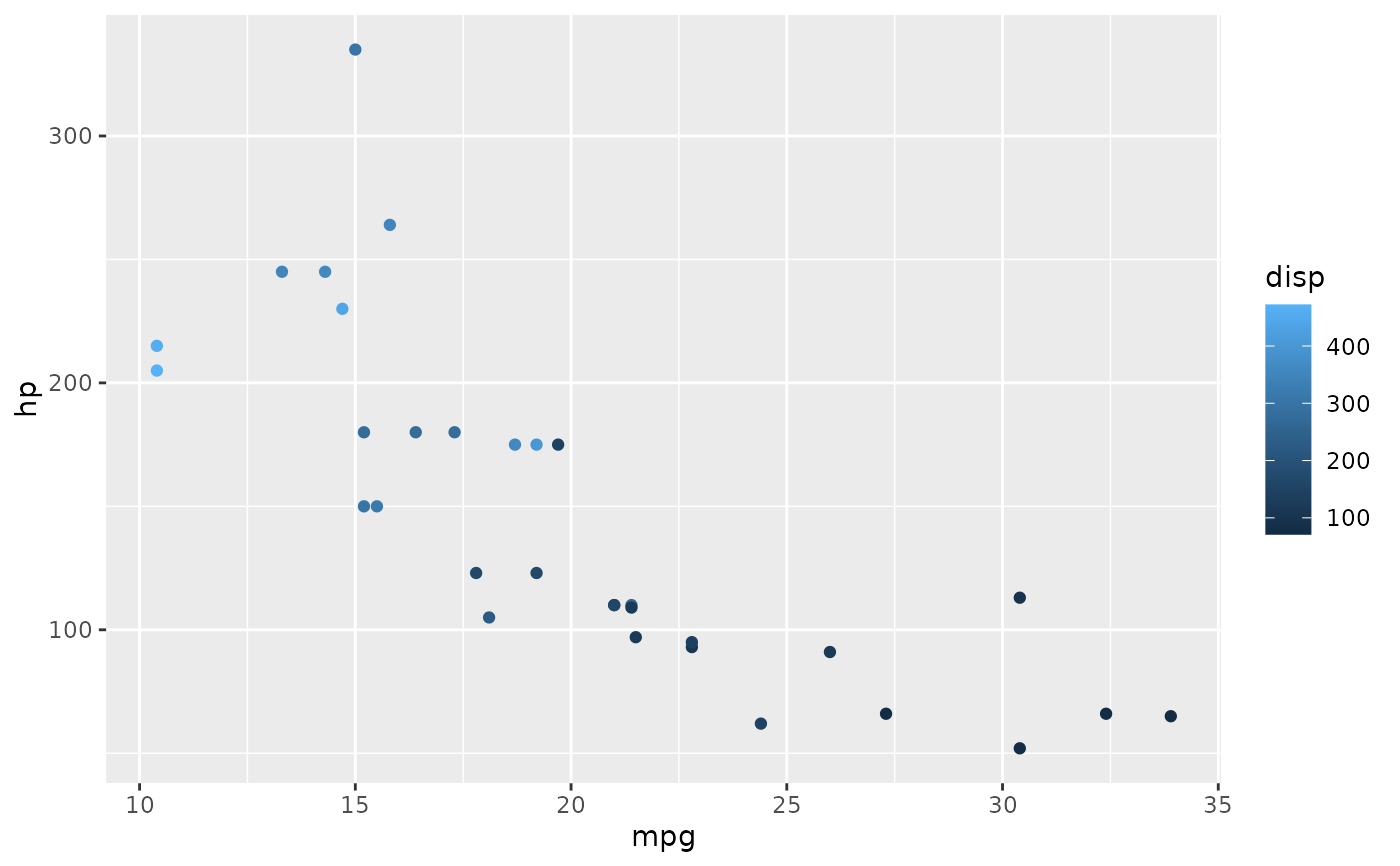 p <- ggplot(mtcars, aes(mpg, hp, colour=disp)) + geom_point()