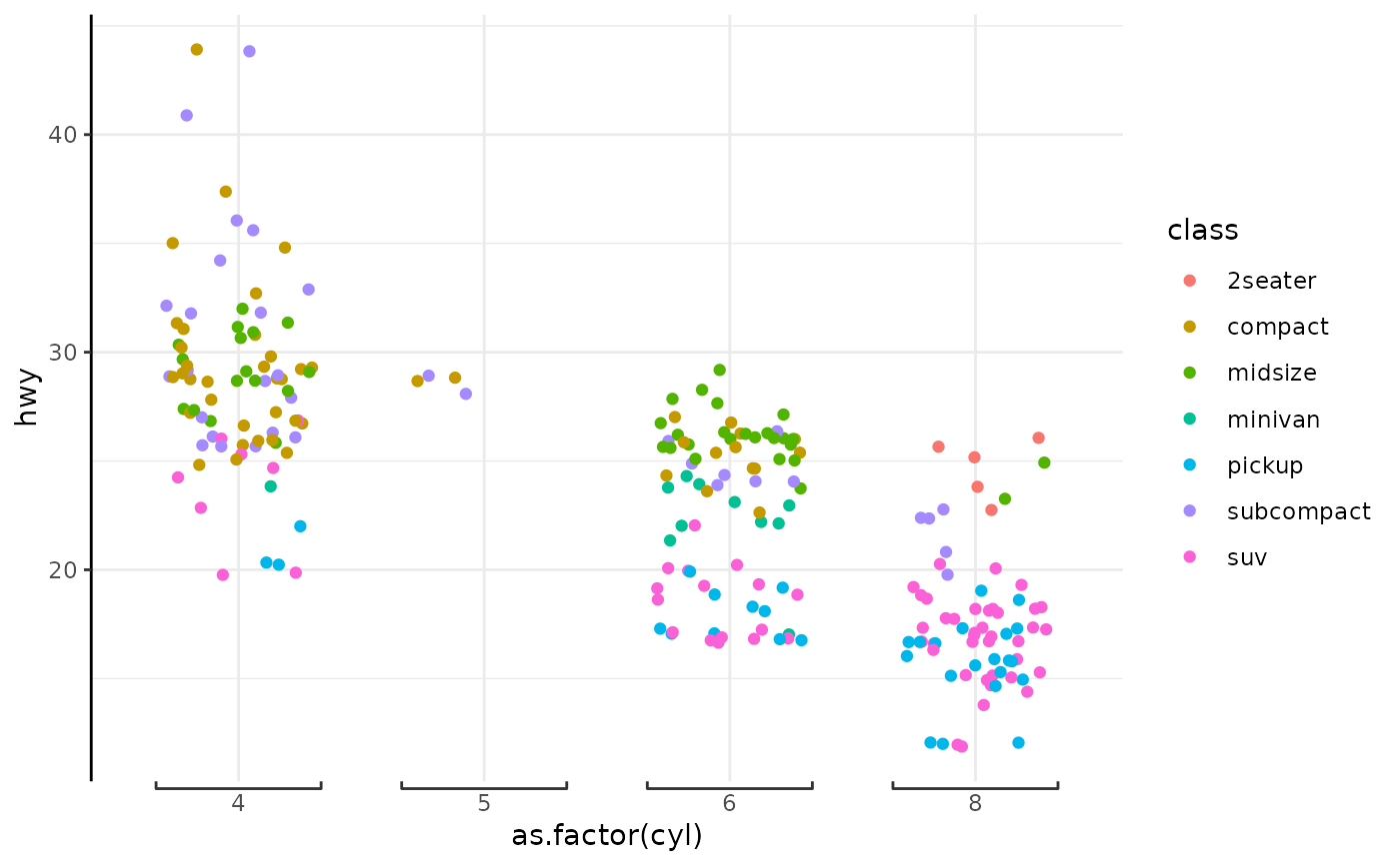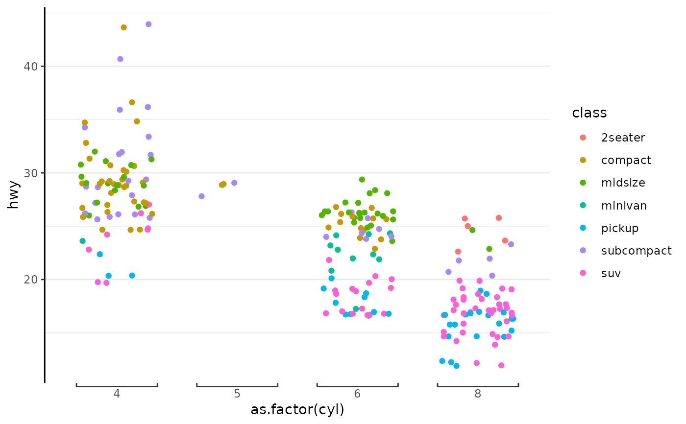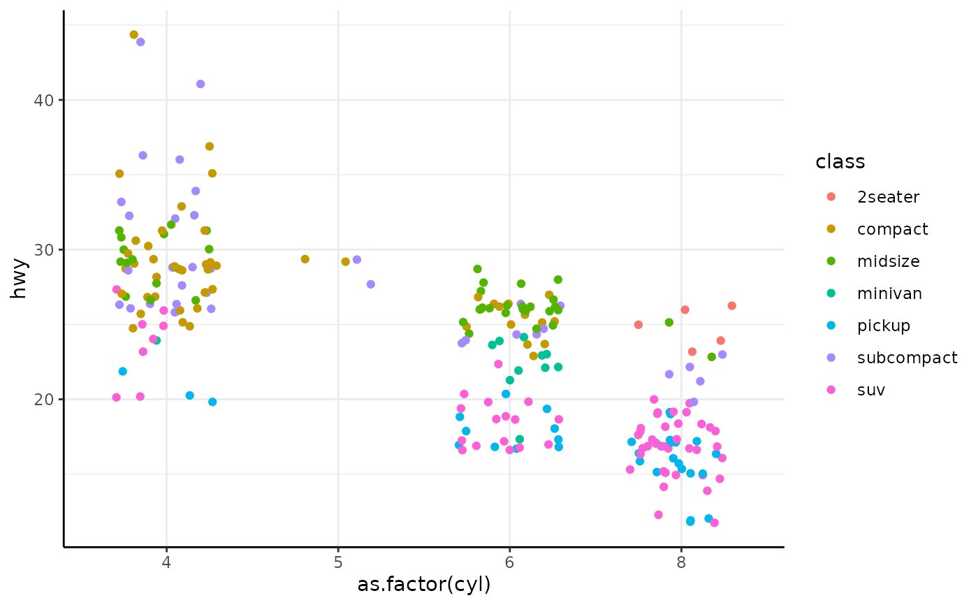 p <- ggplot(mpg, aes(as.factor(cyl), hwy, colour=class)) +