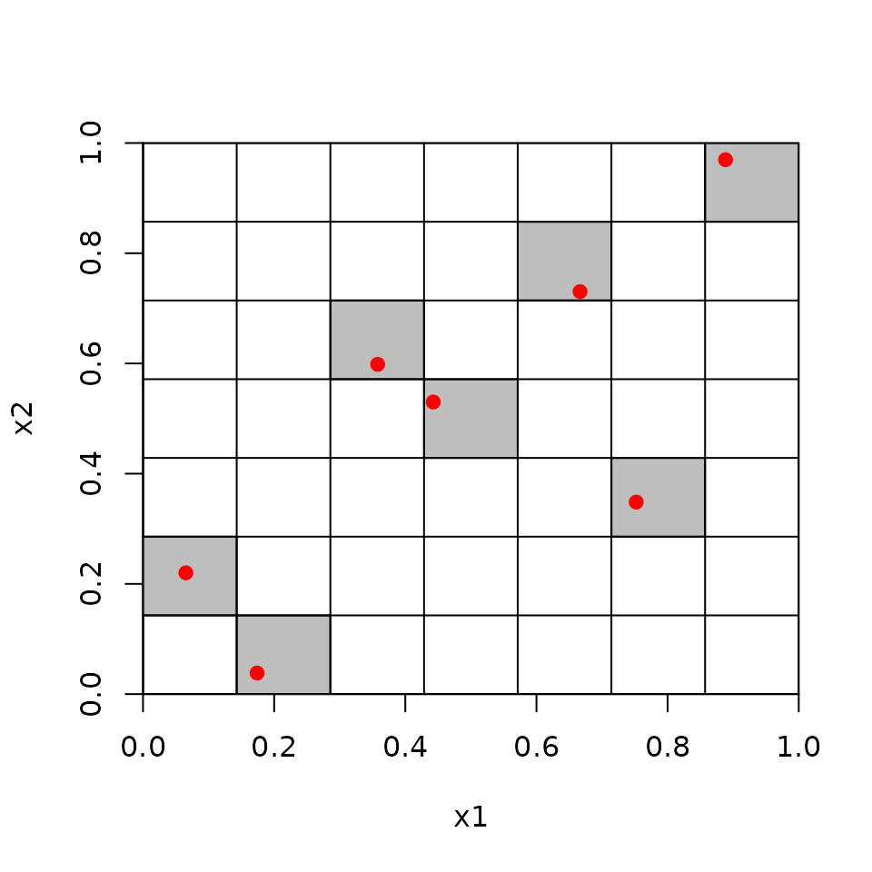 to find empty cells.Also notice that because the original points are randomly placed within the cells, depending on how you bin the marginal distributions, a histogram (of x1 for example) will not necessarily be exactly uniform.