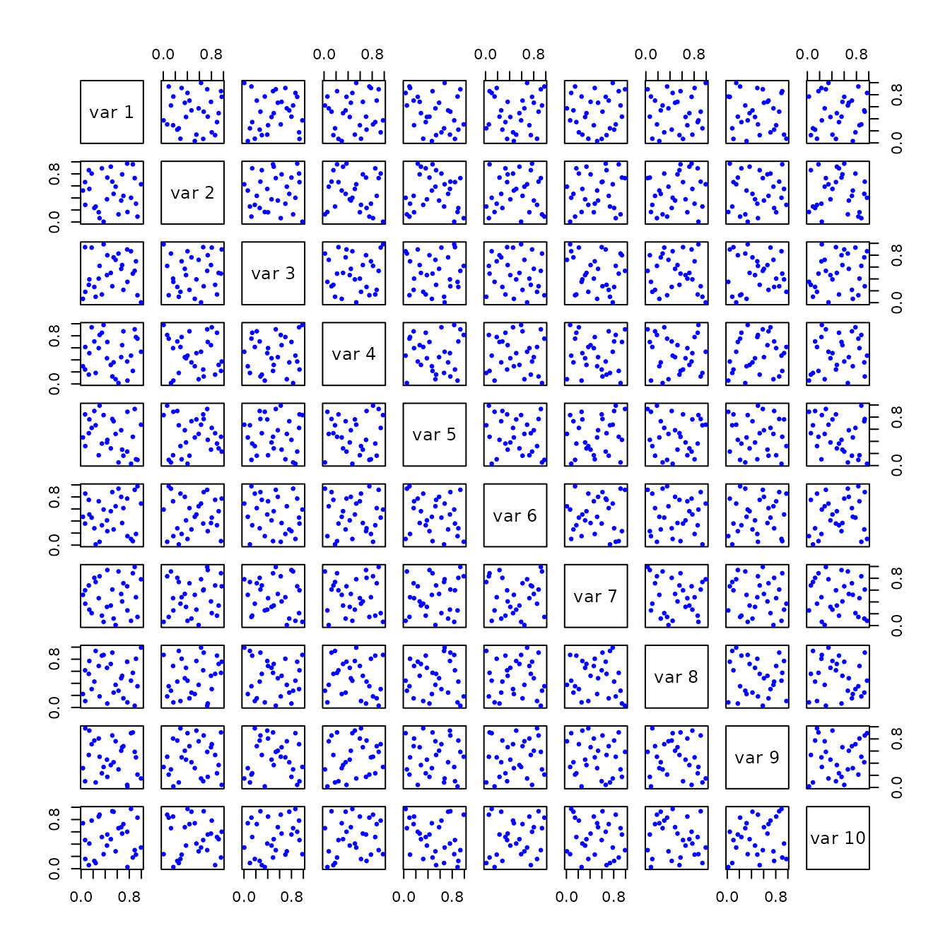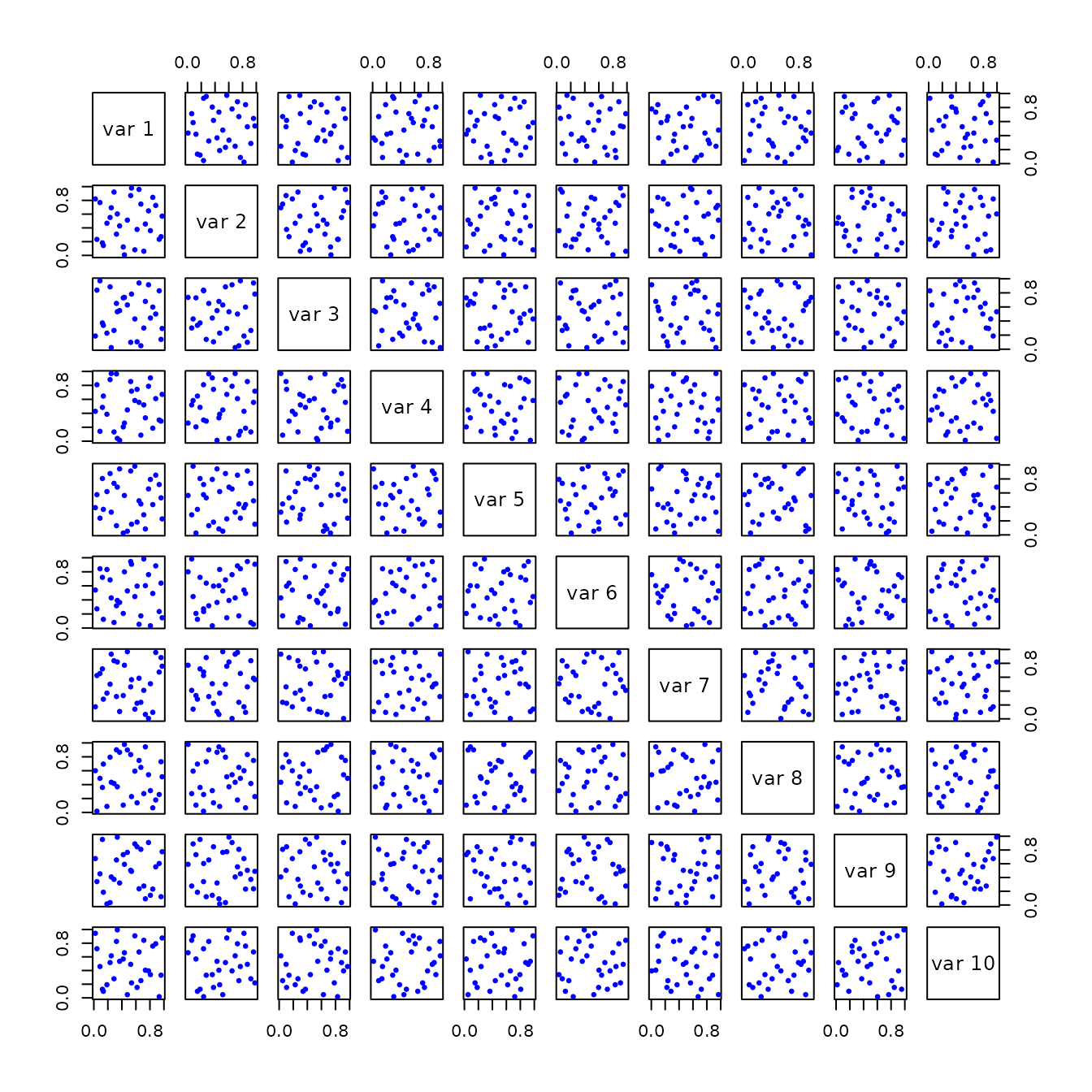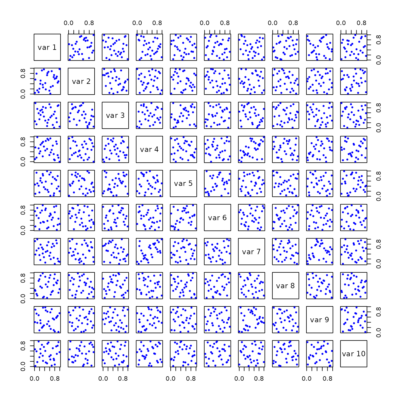 A5 <- geneticLHS(30, 10, pop = 1000, gen = 8, pMut = 0.1, criterium = "Maximin")| Method | Min Distance btwn pts | Mean Distance btwn pts | Max Correlation btwn pts :—–|:—–:|:—–:|:—–: randomLHS | 0.6346585 | 1.2913235 | 0.5173006 optimumLHS | 0.8717797 | 1.3001892 | 0.1268209 maximinLHS | 0.595395 | 1.2835191 | 0.2983643 improvedLHS | 0.6425673 | 1.2746711 | 0.5711527 geneticLHS (S) | 0.8340751 | 1.3026543 | 0.3971539 geneticLHS (Maximin) | 0.8105733 | 1.2933412 | 0.5605546 |