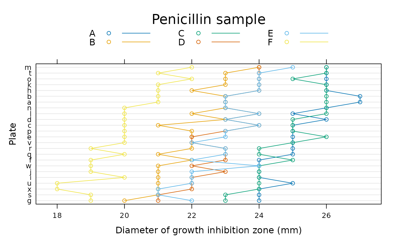 samplepenicillin sample. A factor with levels ‘A’ to ‘F’.
