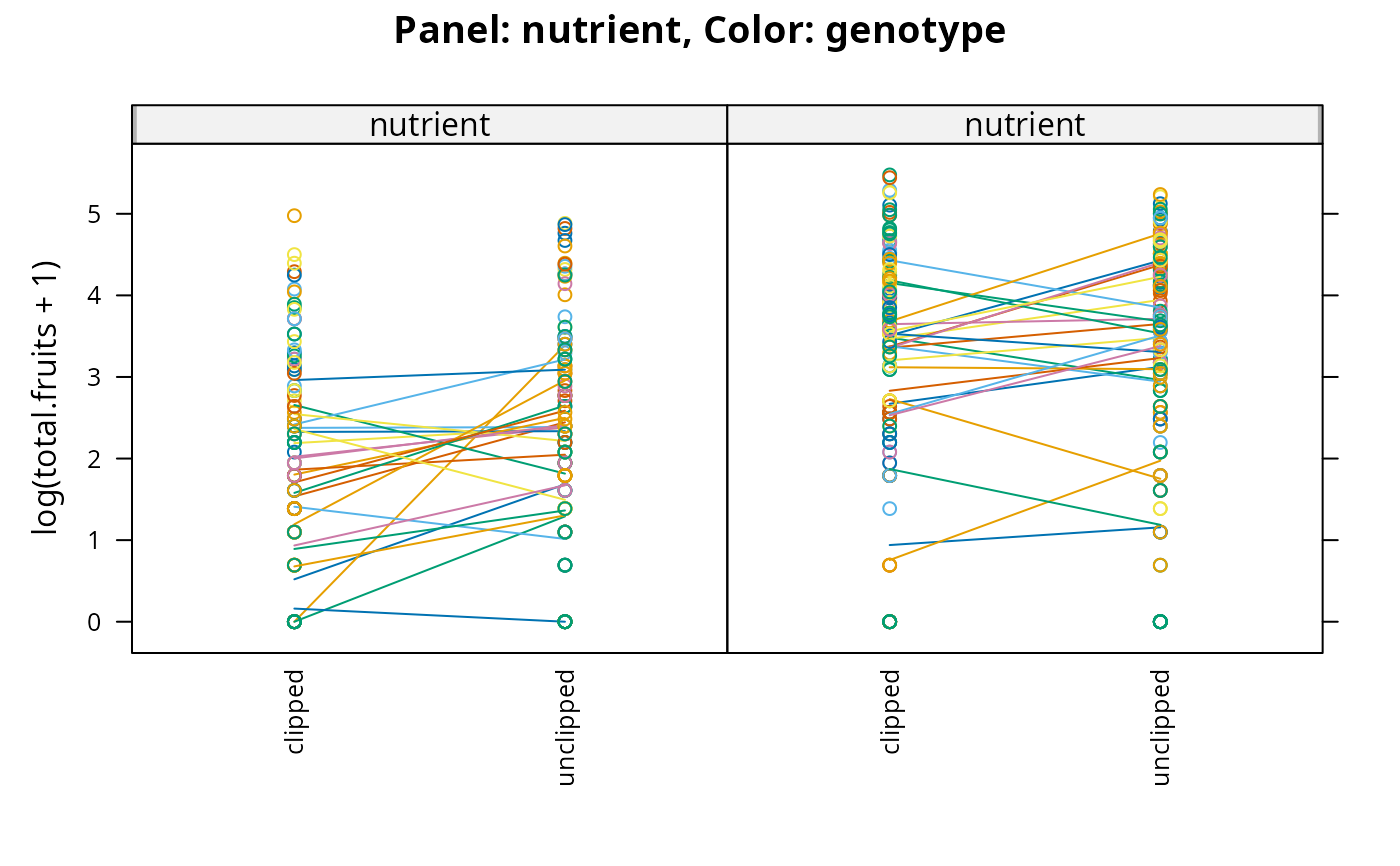 stripplot(log(total.fruits+1) ~ amd|nutrient, data = Arabidopsis,